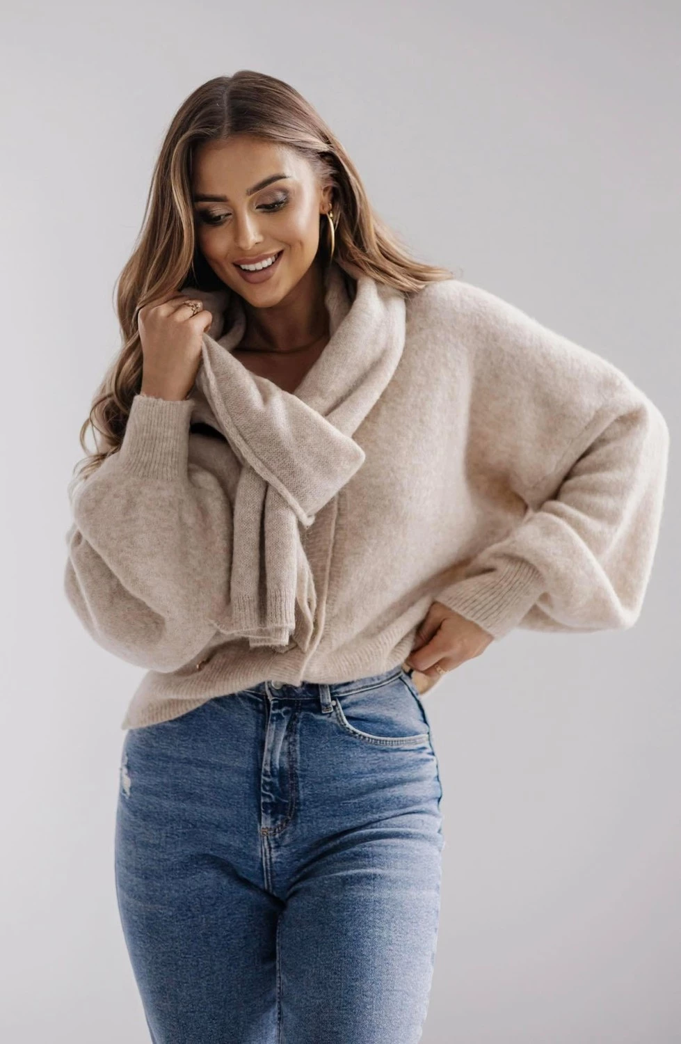 Komplet damski z angorą i wełną, szal z czapką i rękawiczkami beżowy