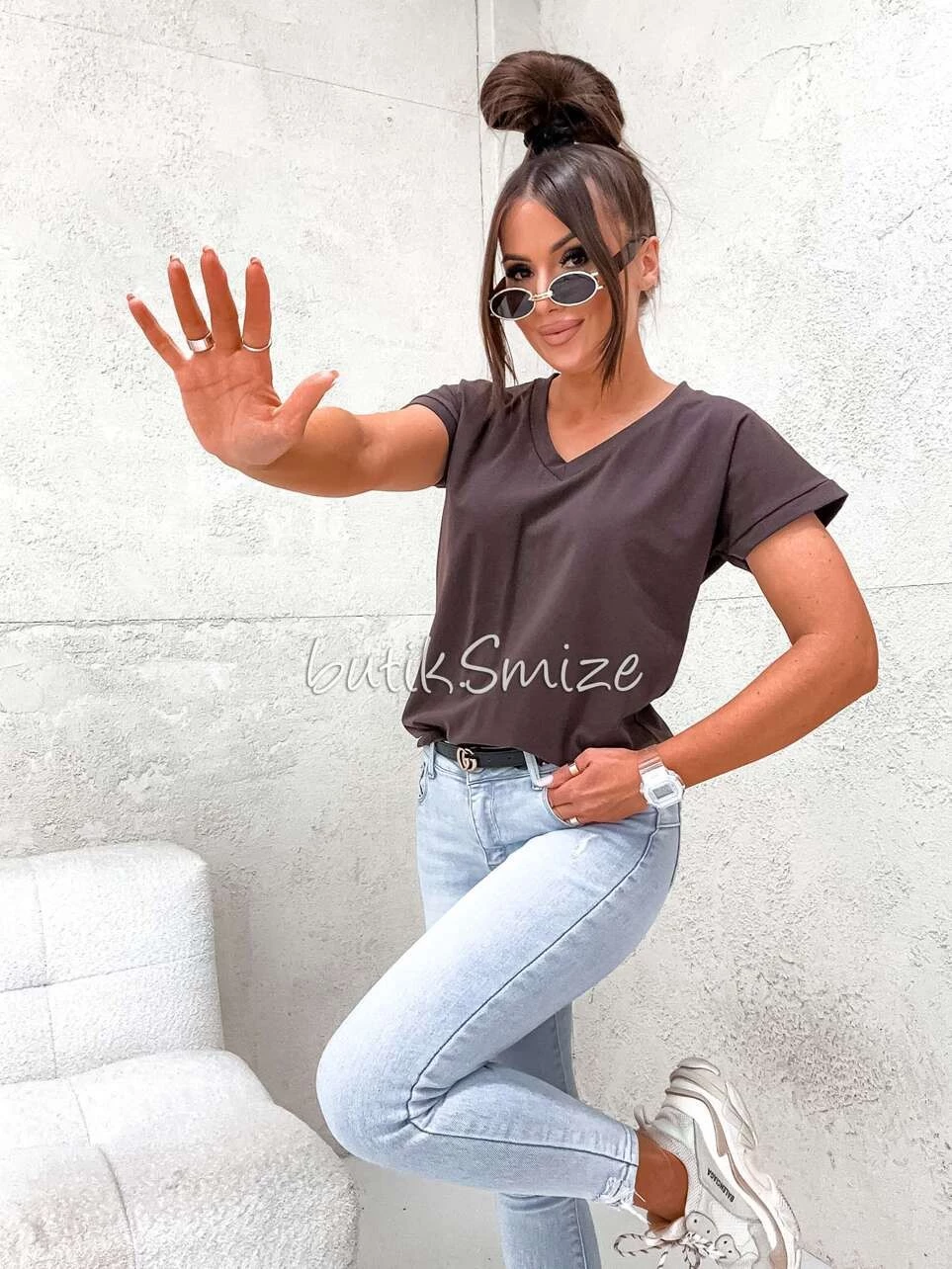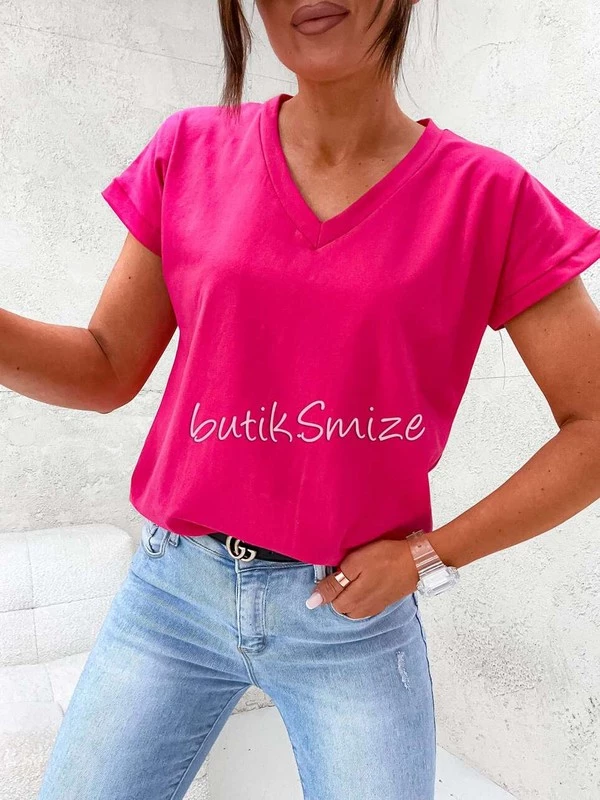 Gładki T-shirt bawełniany V neck classic Smize