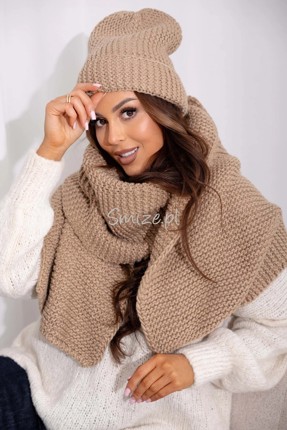 Komplet damski z angorą i wełną, szal z czapką i rękawiczkami latte