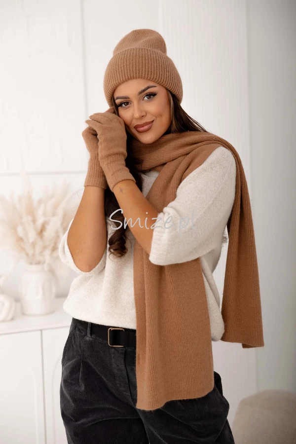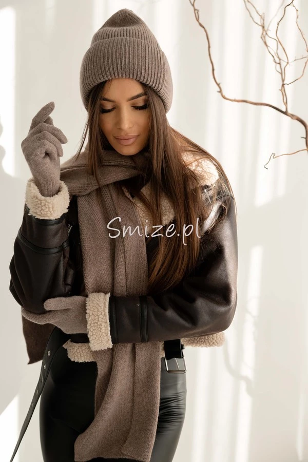 Komplet damski z angorą i wełną, szal z czapką i rękawiczkami mokka