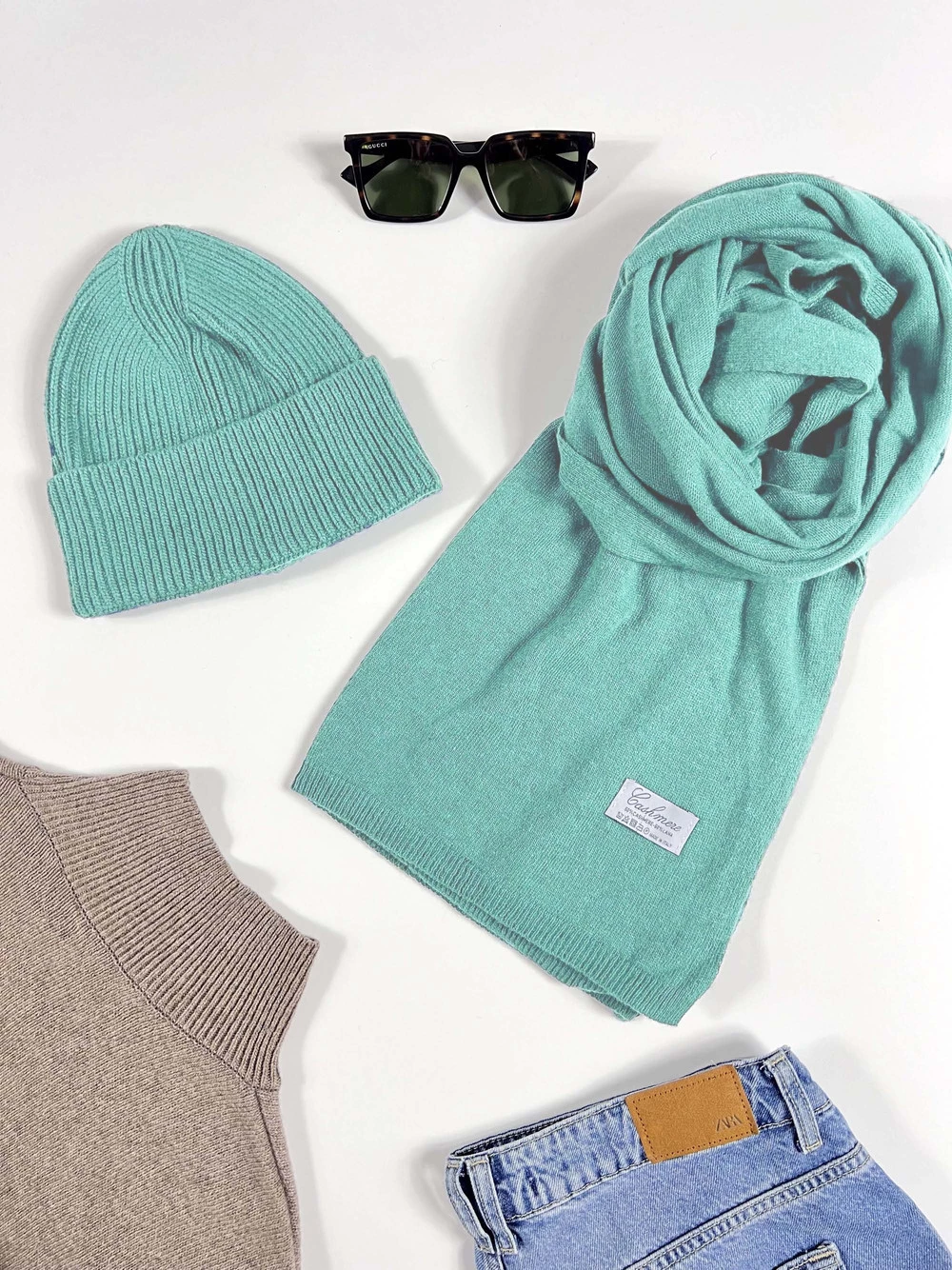 Komplet kaszmirowy miętowy, szal z czapką CASHMERE