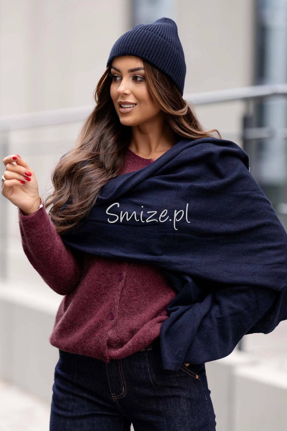 Komplet kaszmirowy granatowy, szal z czapką CASHMERE
