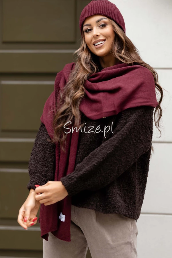 Komplet kaszmirowy bordowy, szal z czapką CASHMERE