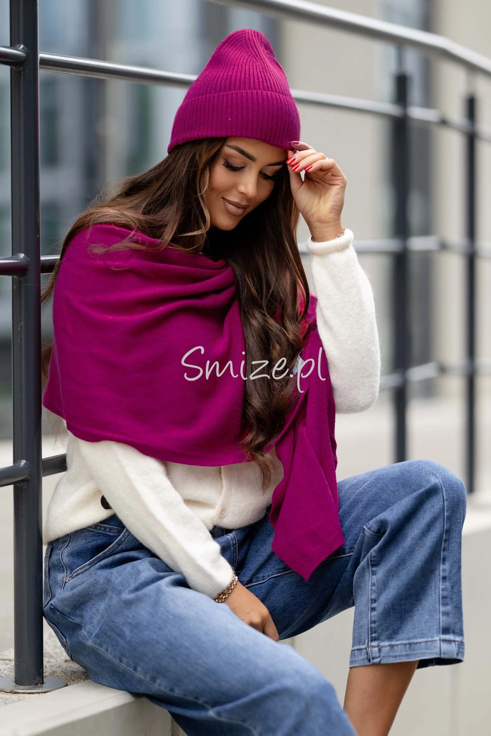 Komplet kaszmirowy amarantowy, szal z czapką CASHMERE