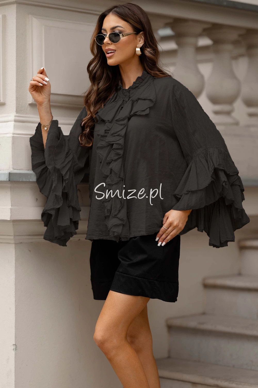 Bawełniana bluzka z falbanami i rozkloszowanymi rękawami, czarna
