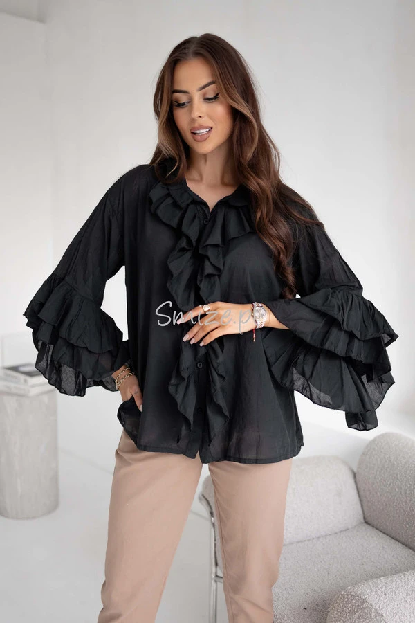 Bawełniana bluzka z falbanami i rozkloszowanymi rękawami, czarna