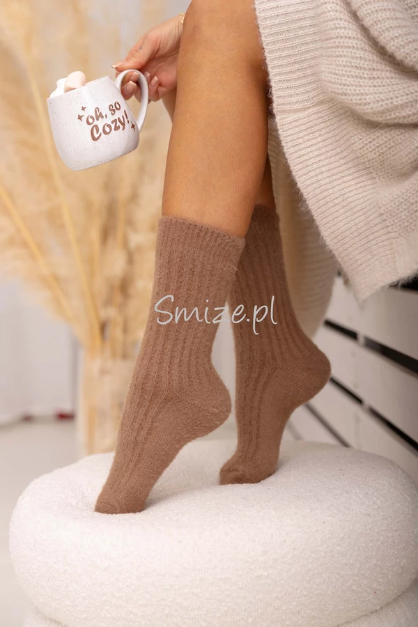 Skarpetki z angory gładkie z haftowaną kokardką, mokka