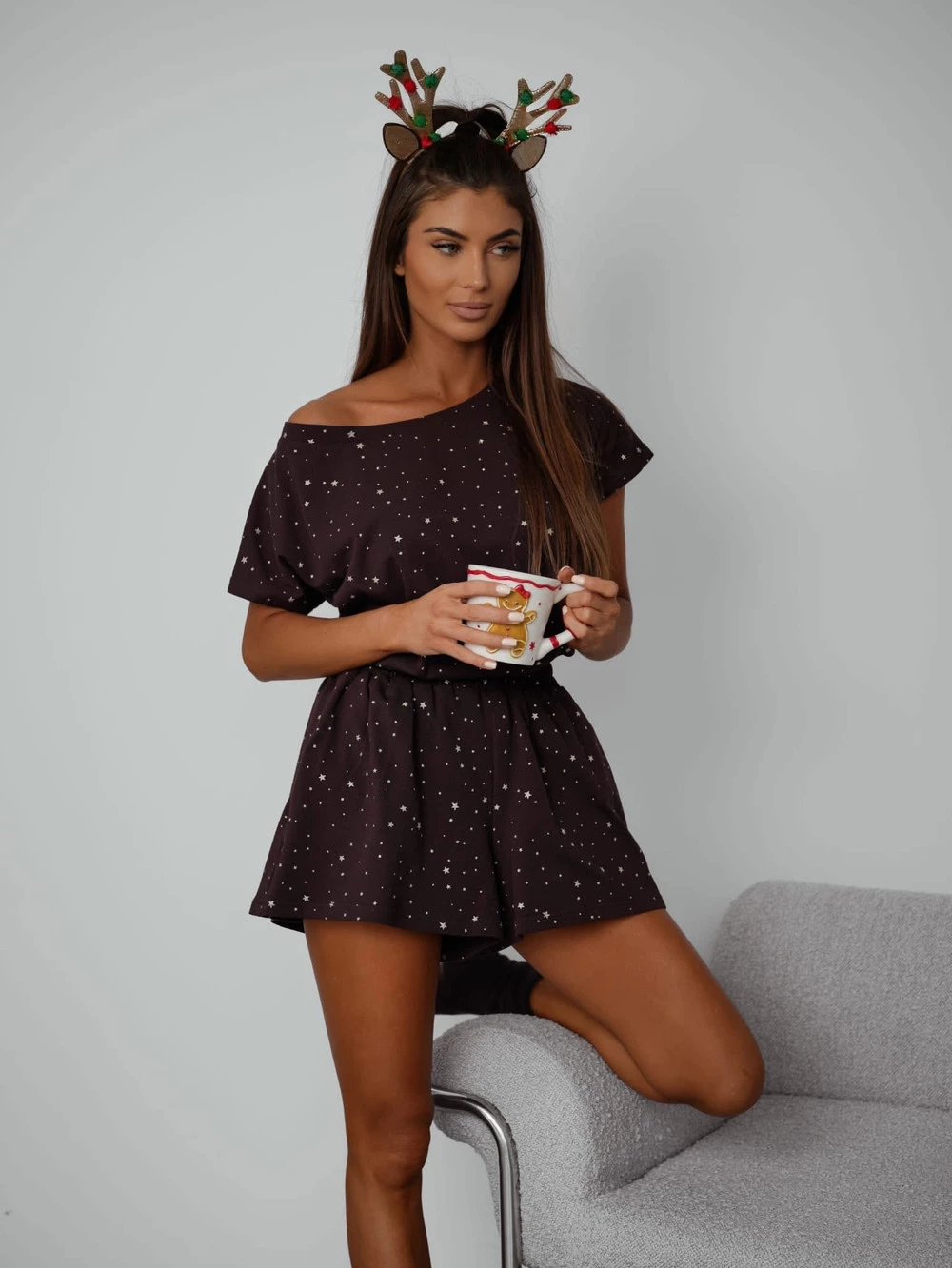 Piżama damska z szortami, w gwiazdki BOCCA, czekoladowa