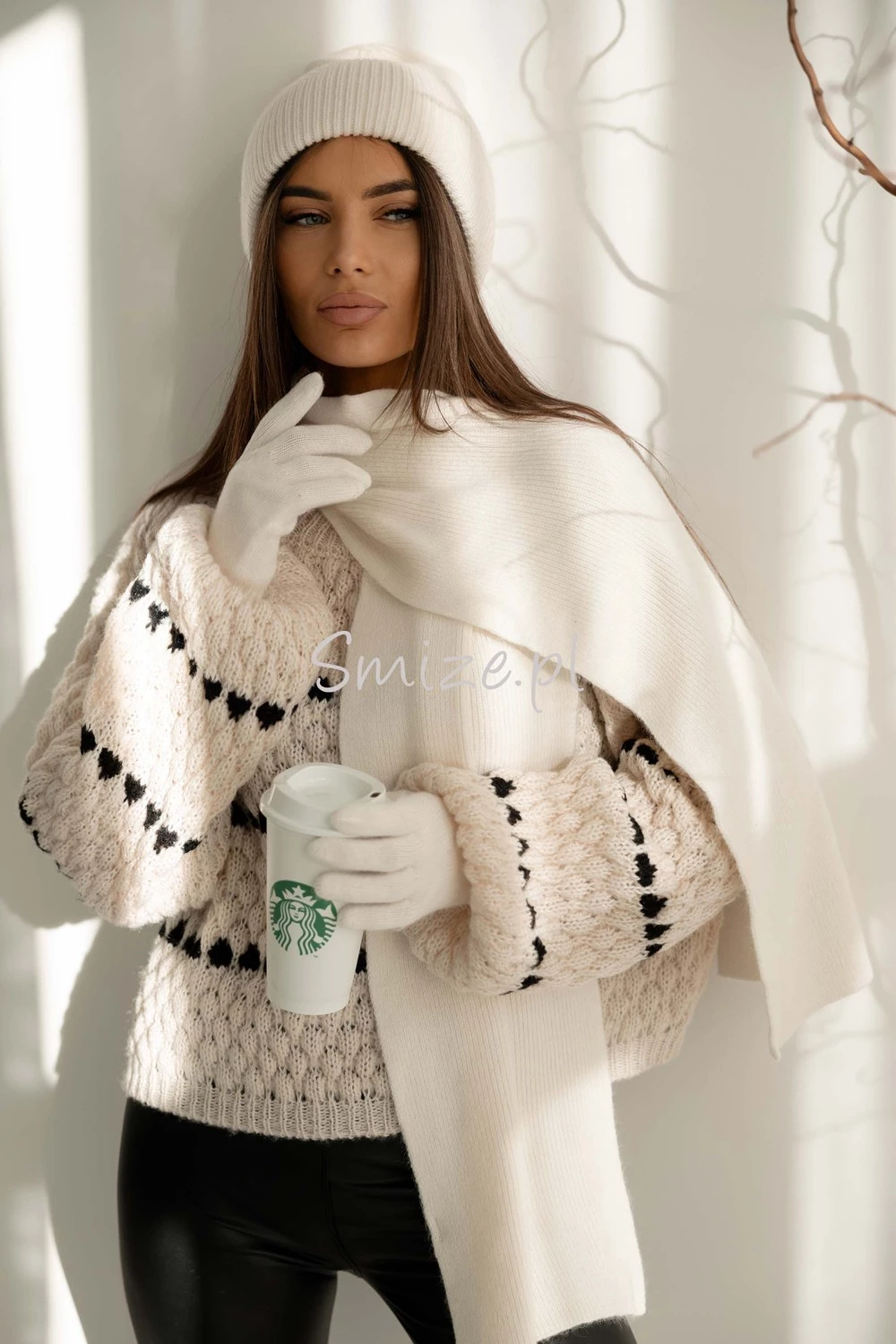 Komplet damski z angorą i wełną, szal z czapką i rękawiczkami śmietankowy