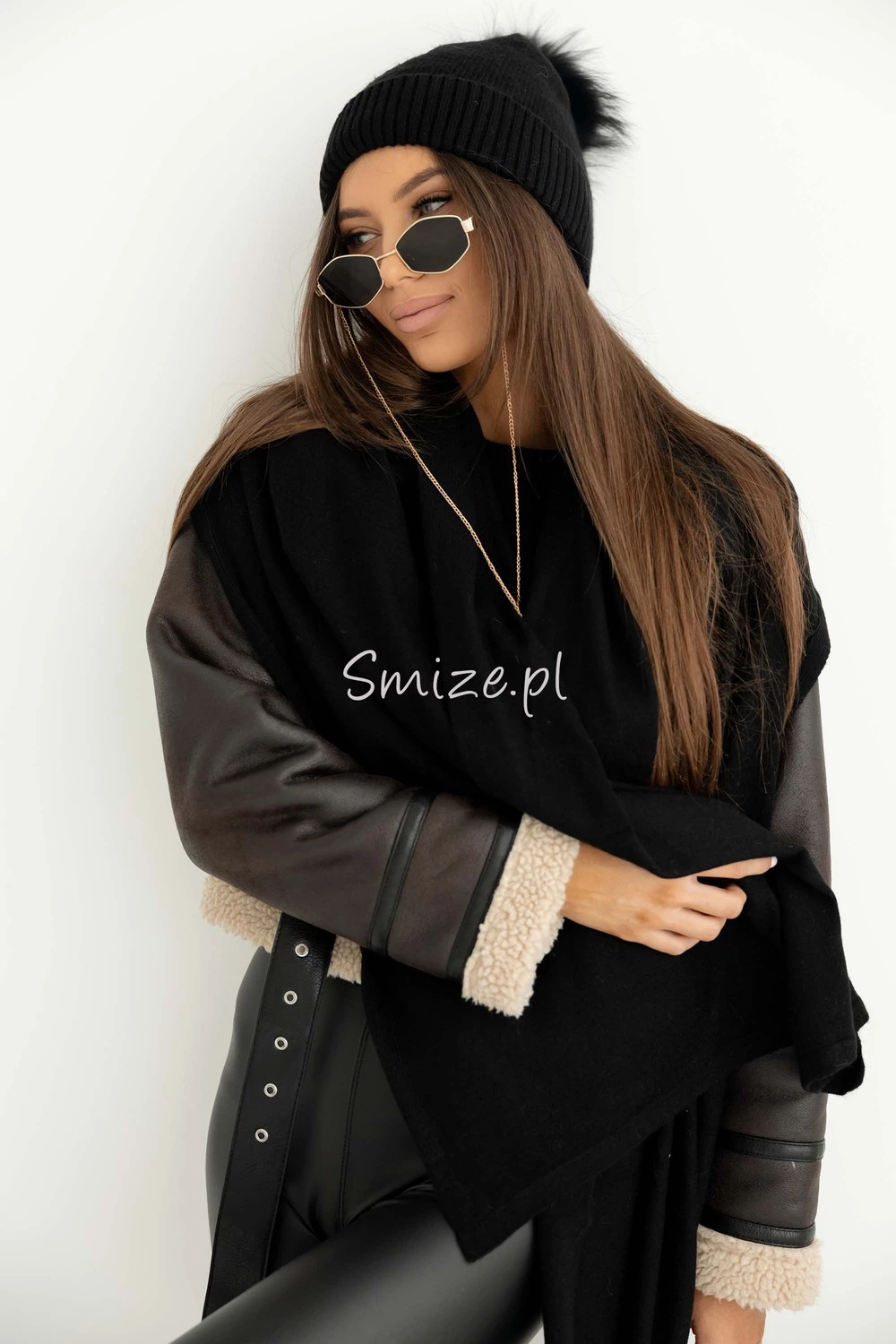Komplet damski z angorą, szal z czapką z jenotem czarny