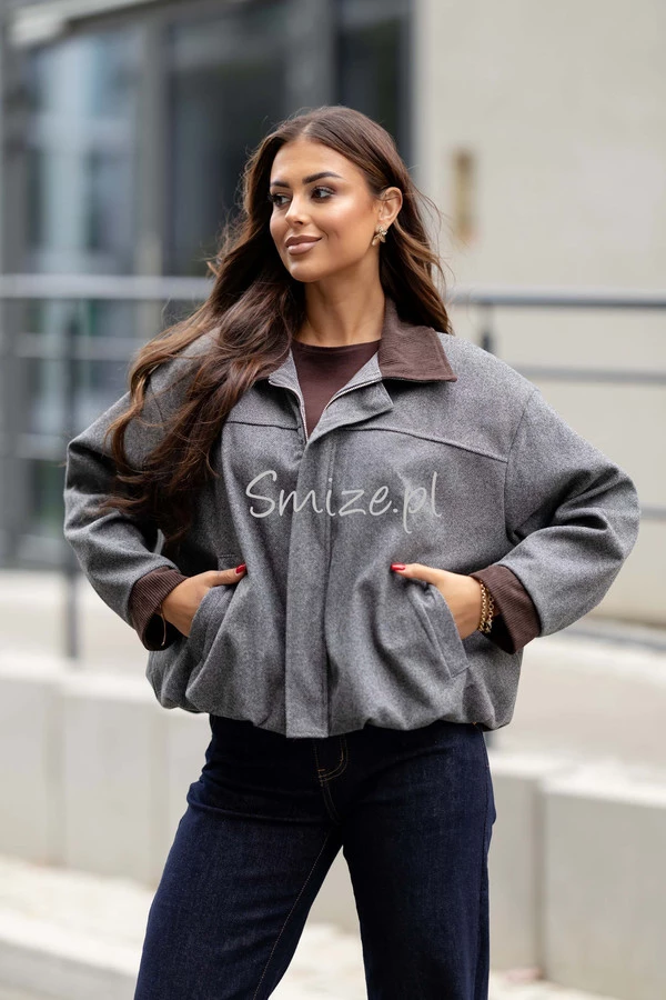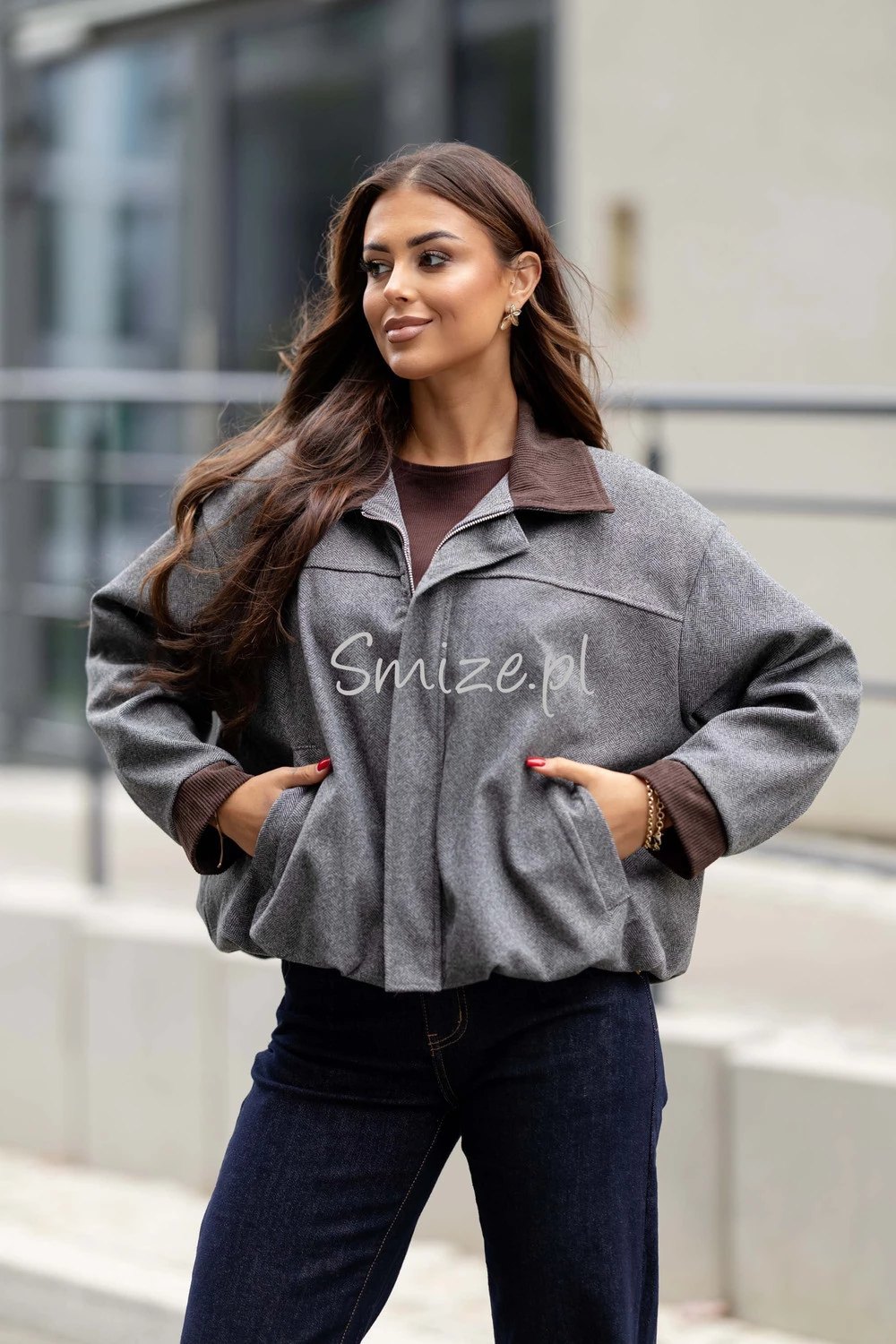 Kurtka damska w jodełkę ze sztruksowym kołnierzem, szara