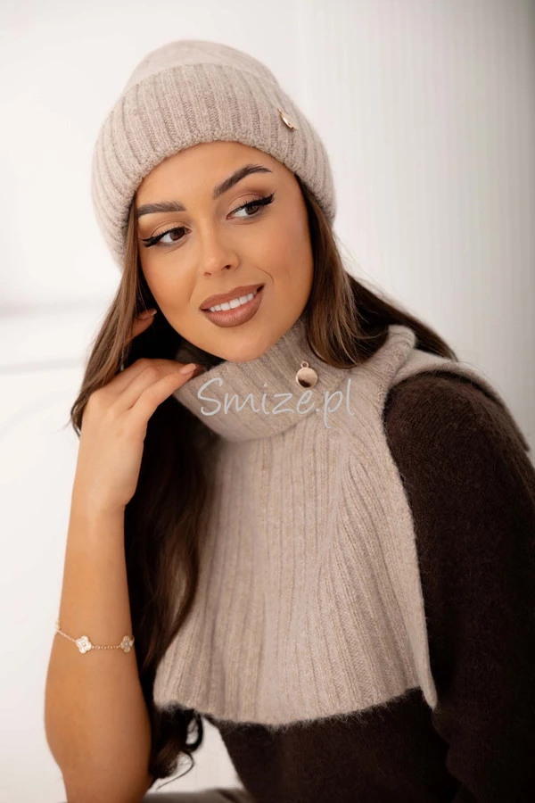 Komplet Czapka i komin z golfem, z angory i wełny / cappucino