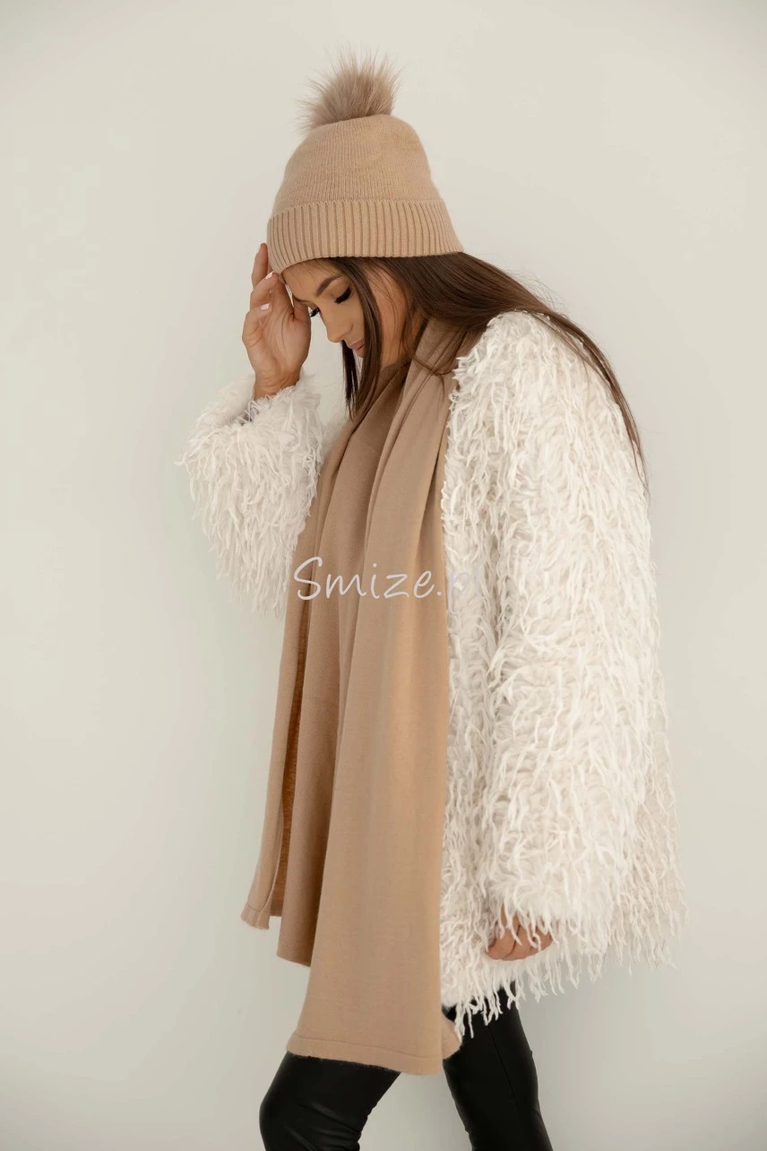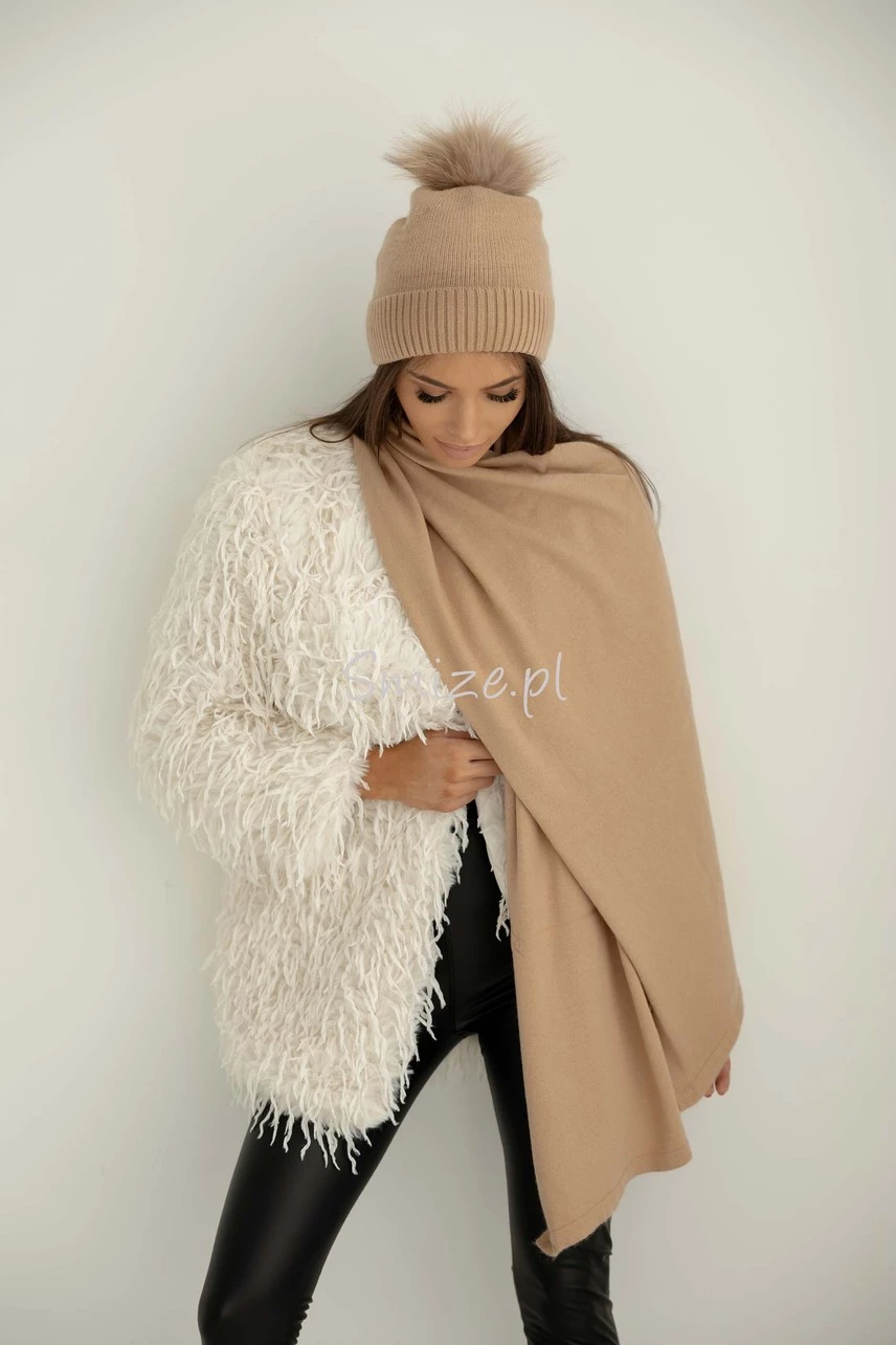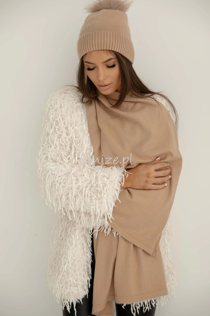 Komplet damski z angorą, szal z czapką z jenotem beżowy