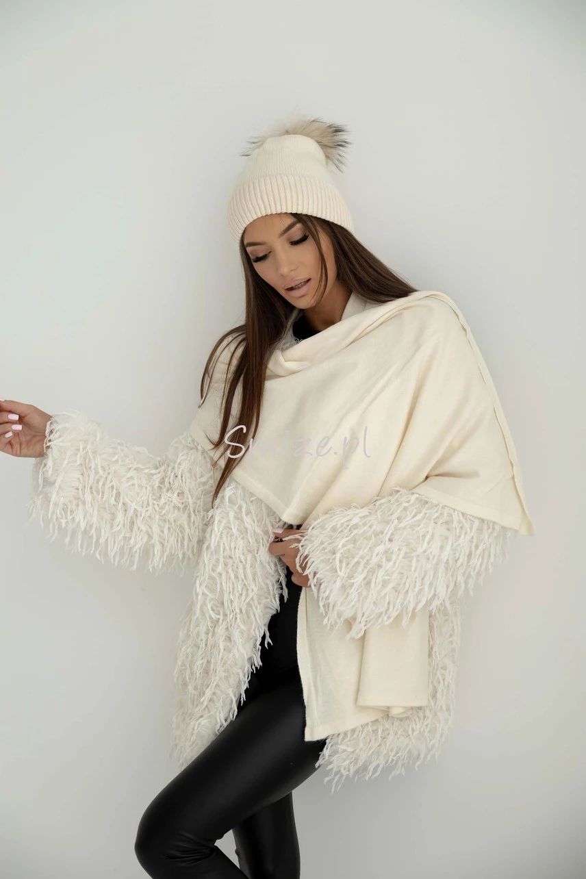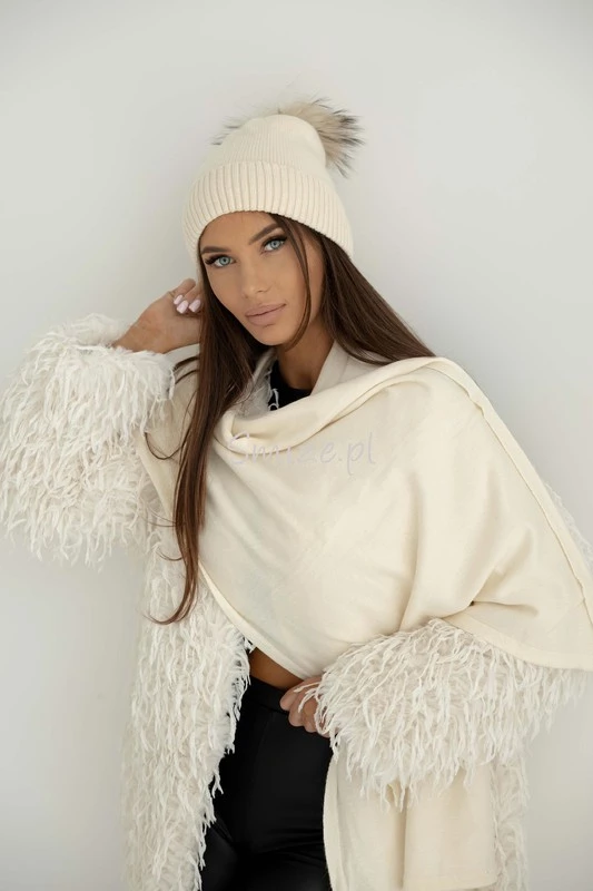 Komplet damski z angorą, szal z czapką z jenotem śmietankowy