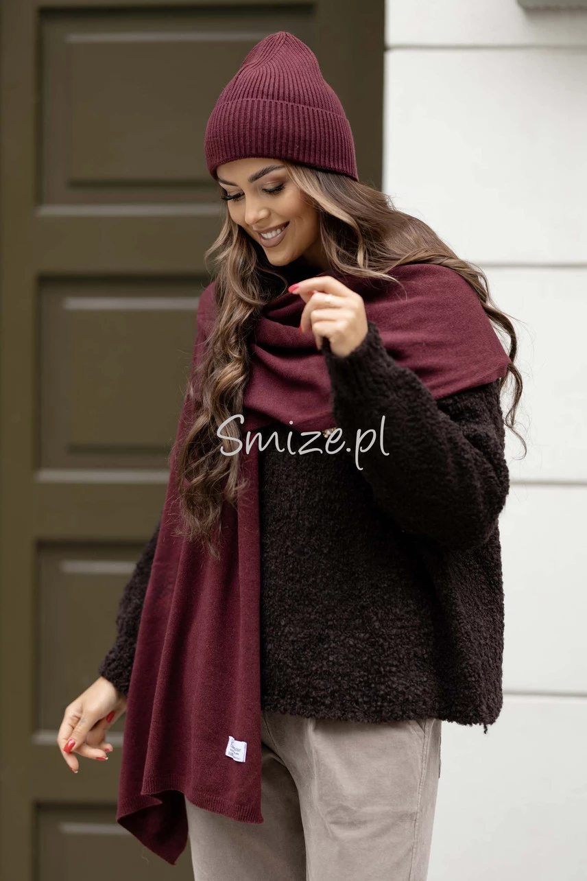 Komplet kaszmirowy bordowy, szal z czapką CASHMERE