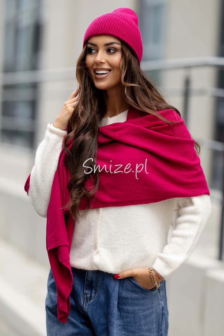 Opinie o Komplet kaszmirowy malinowy, szal z czapką CASHMERE