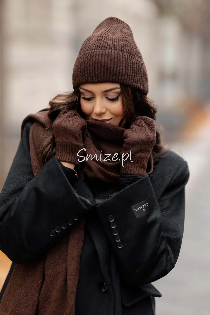 Zestaw dostępny w kolorze „fango” oraz w innych wariantach (brąz, bordowy, beżowy, czekoladowy, bakłażan), co sprawia, że łatwo dopasujesz go do płaszcza, kurtki czy ramoneski. Rozmiar one size sprawia, że nie musisz martwić się dobieraniem – to świetny pomysł również na prezent.