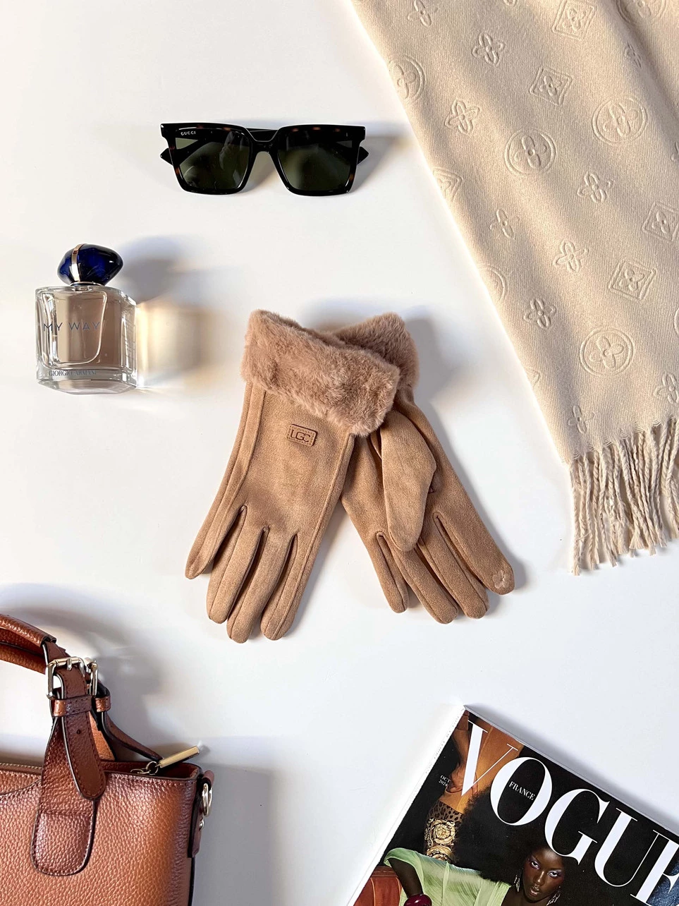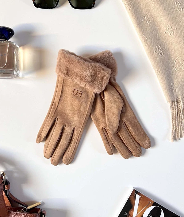 Rękawiczki pięciopalczaste z futerkiem, camel
