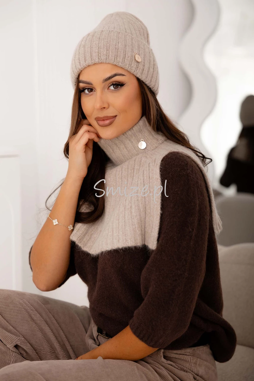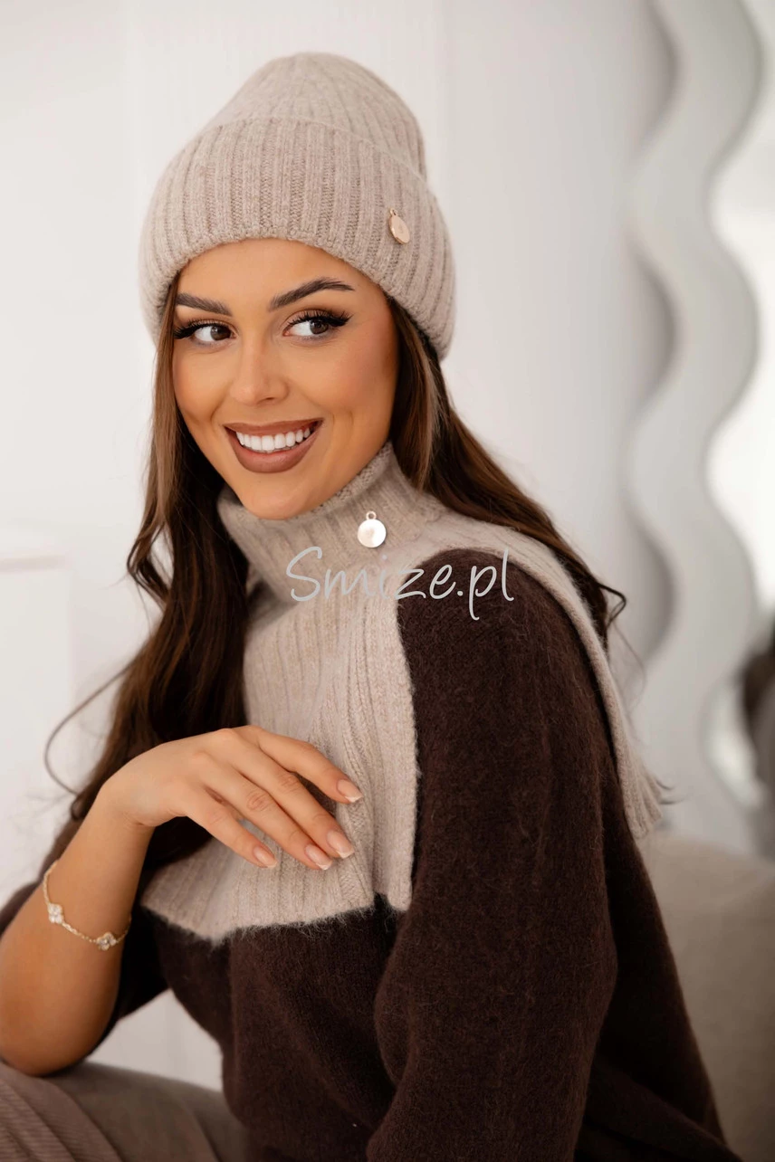 Komplet Czapka i komin z golfem, z angory i wełny / cappucino