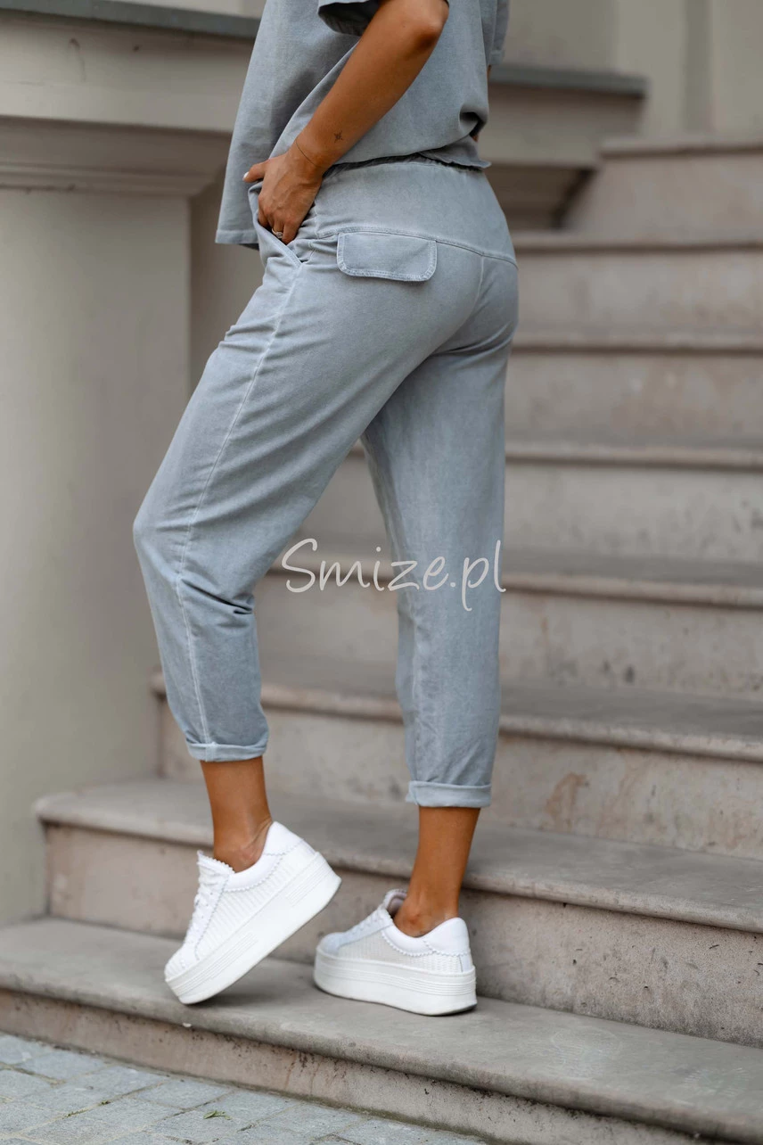 Dresowe spodnie mają gumę w pasie i troczki do związania, a po bokach kieszenie.