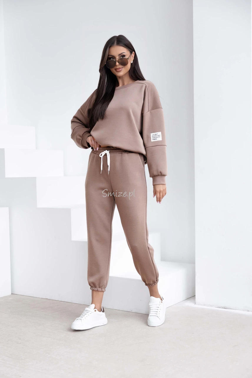 Komplet dresowy masełkowy z naszywką — damski zestaw casual