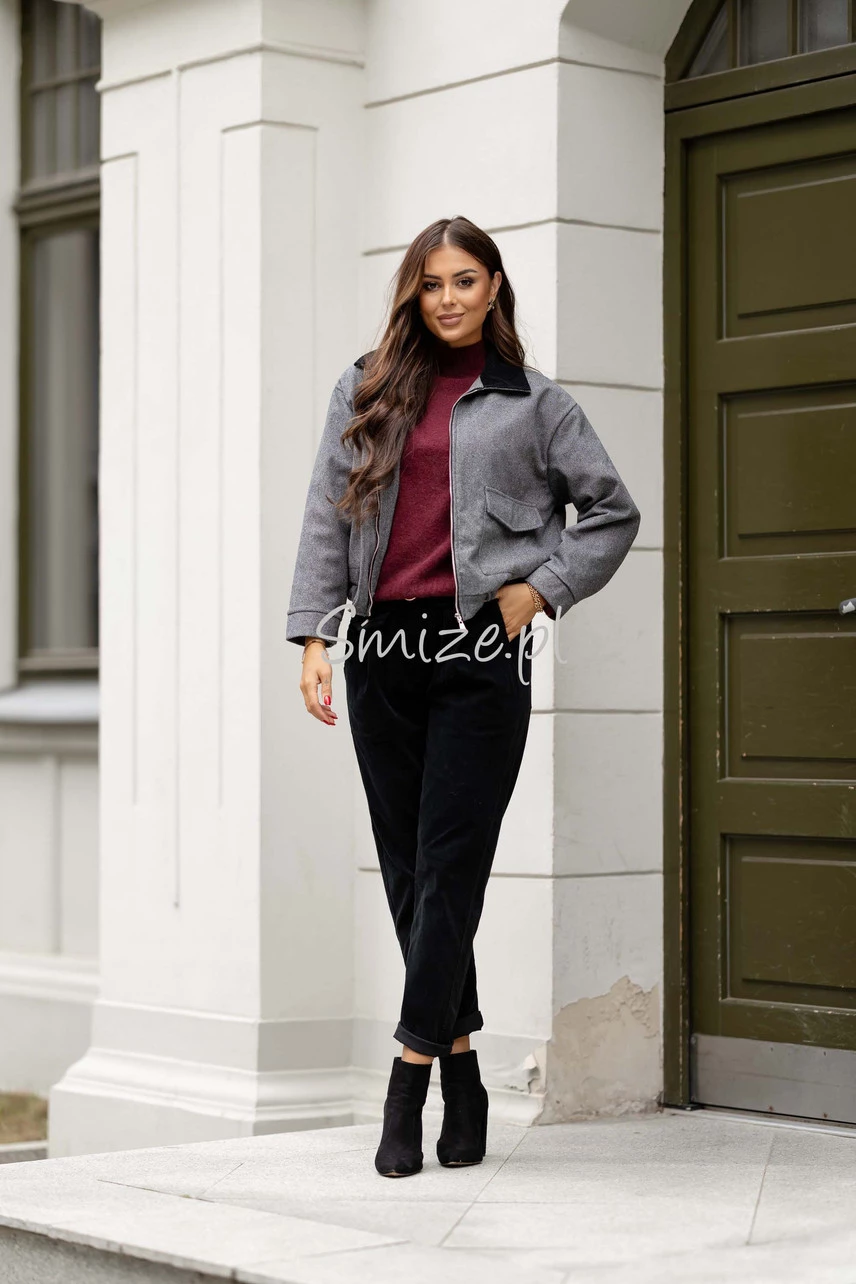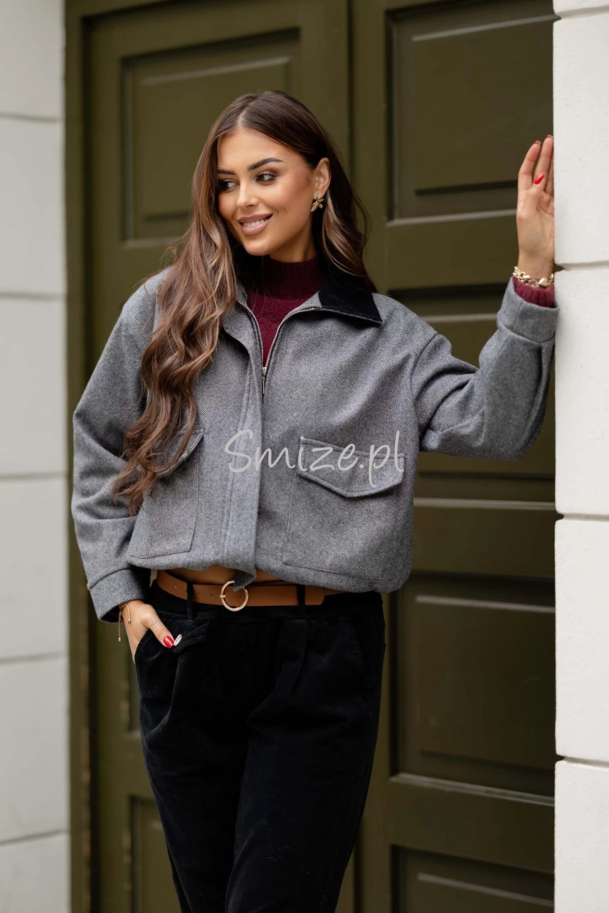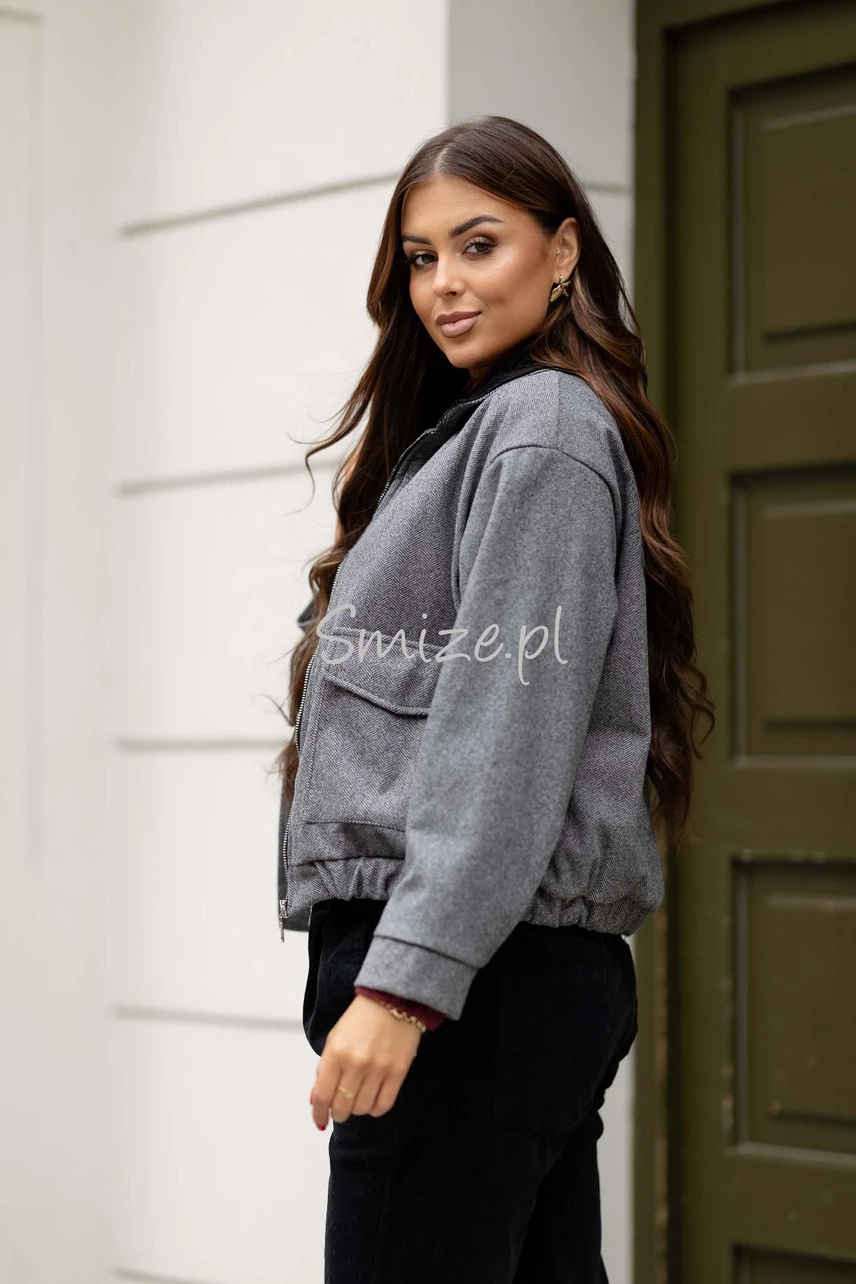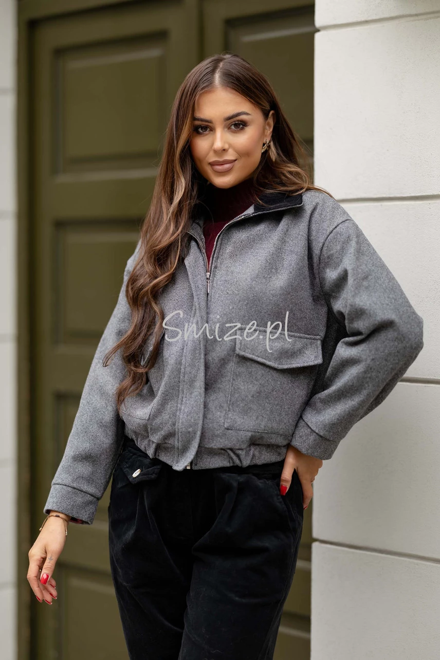 Kurtka damska bomberka w jodełkę, ze sztruksowym kołnierzem, szara
