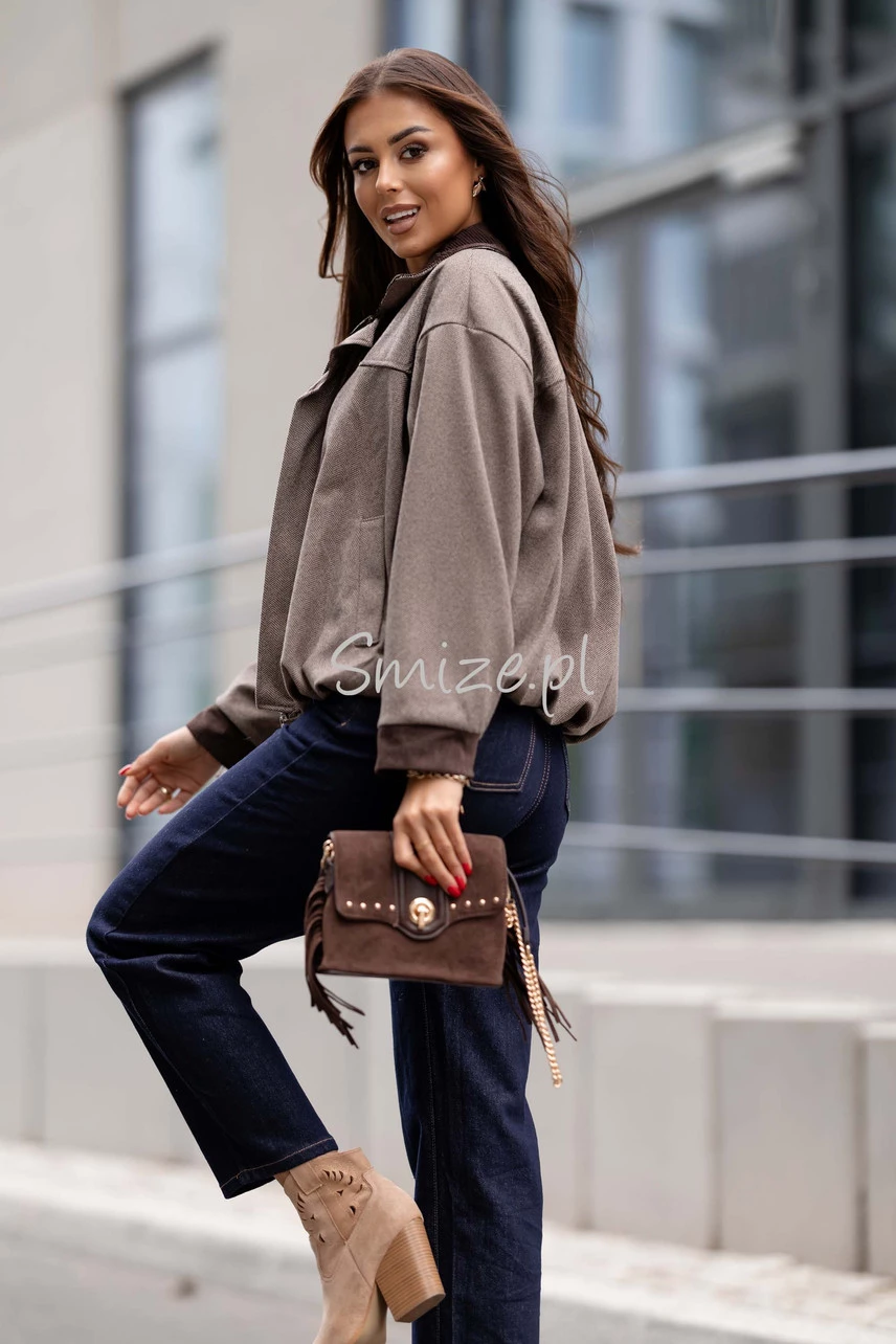 Kurtka damska w jodełkę ze sztruksowym kołnierzem, mokka