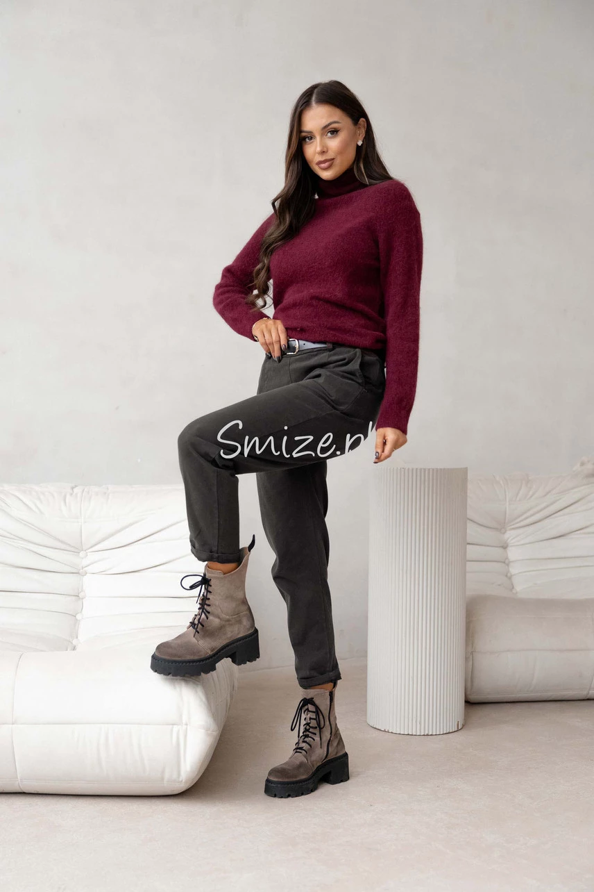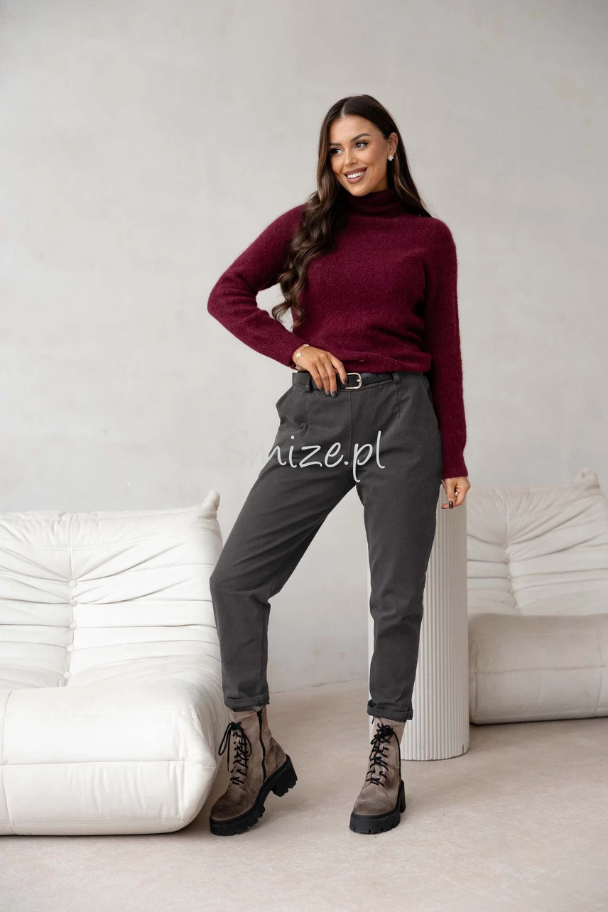 Spodnie pięknie prezentują się z kurtkami, sweterkami typu baby alpaka i koszulami, dostępnymi w naszej ofercie.