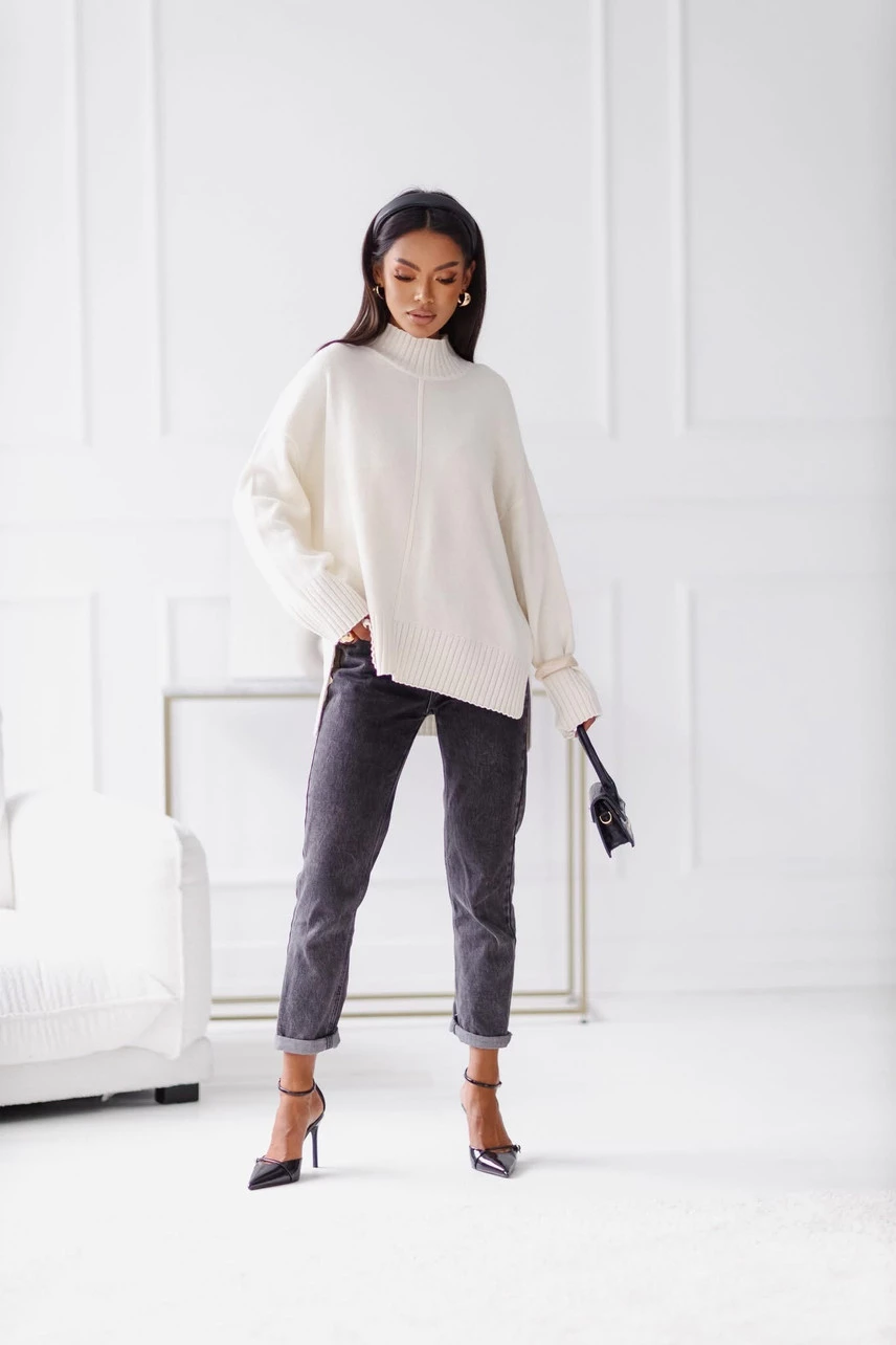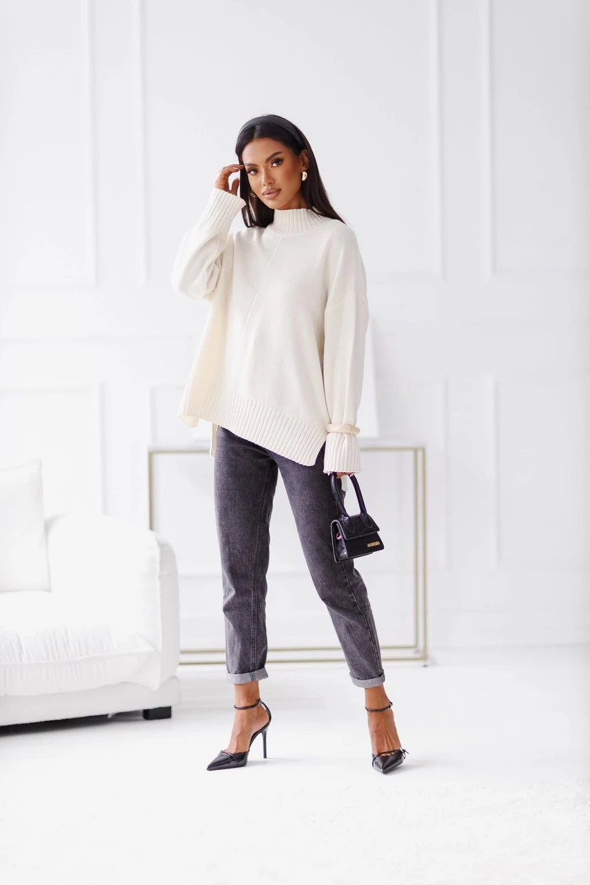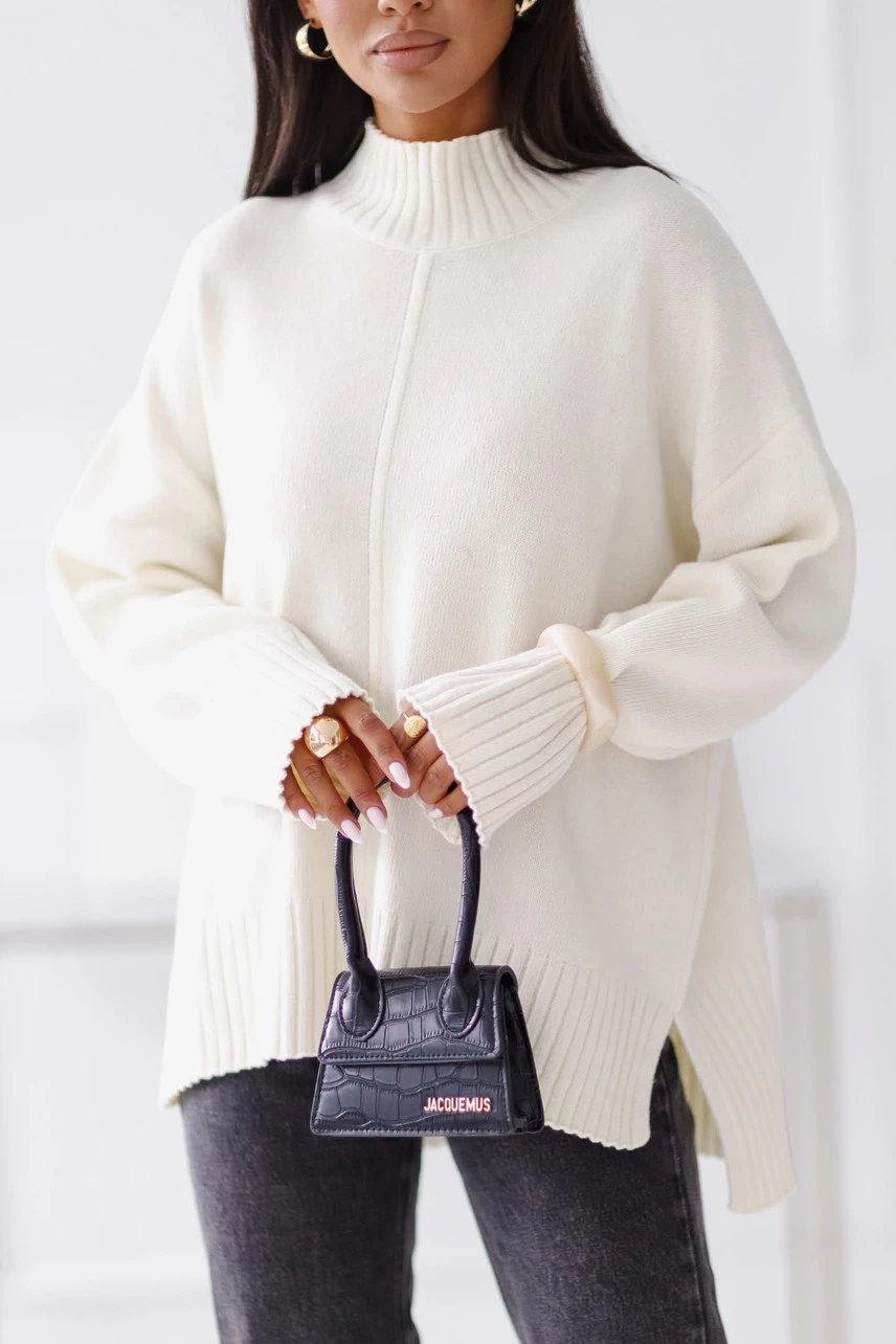 Luźne rękawy i dół swetra wykończone ozdobnym grubym ściągaczem.