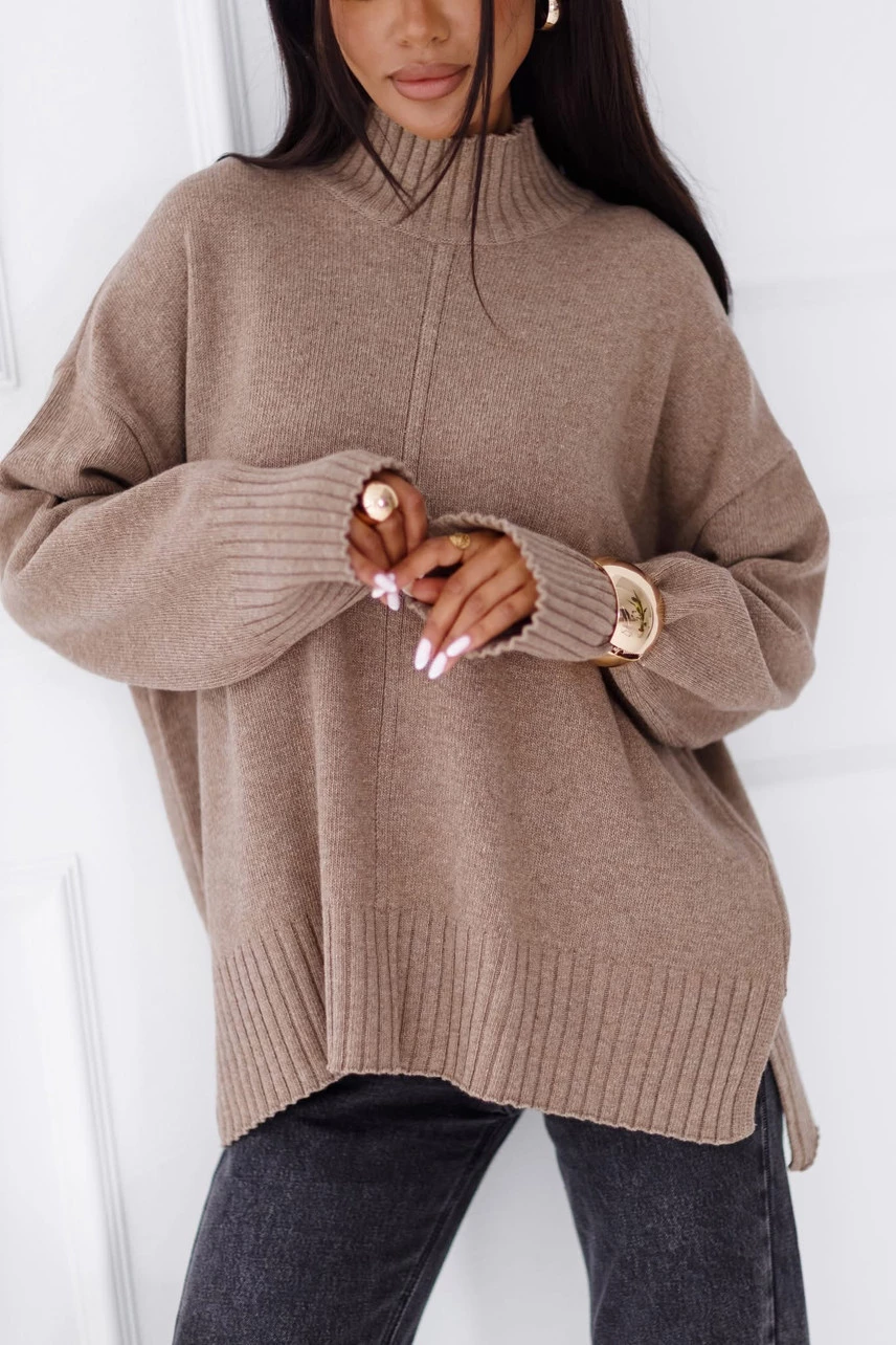 Luźne rękawy i dół swetra wykończone ozdobnym grubym ściągaczem.