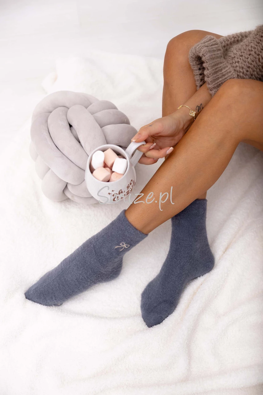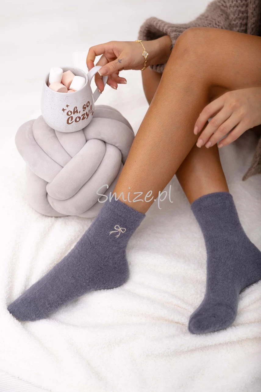 Skarpetki z angory gładkie z haftowaną kokardką, grafitowe