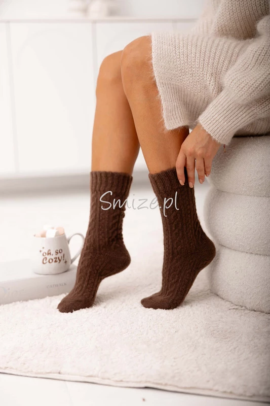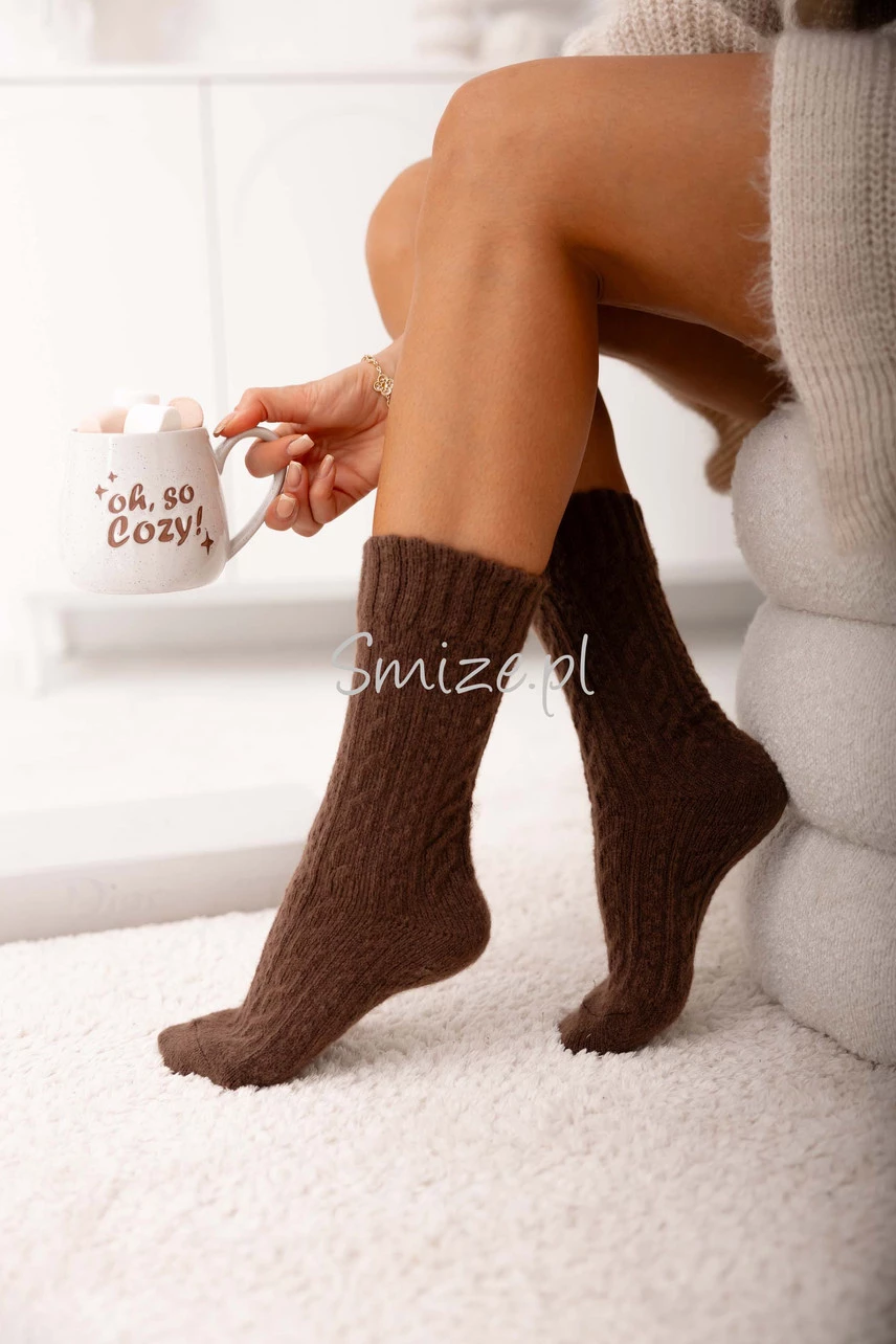 Skarpetki z angory, wzór warkocz, czekoladowe