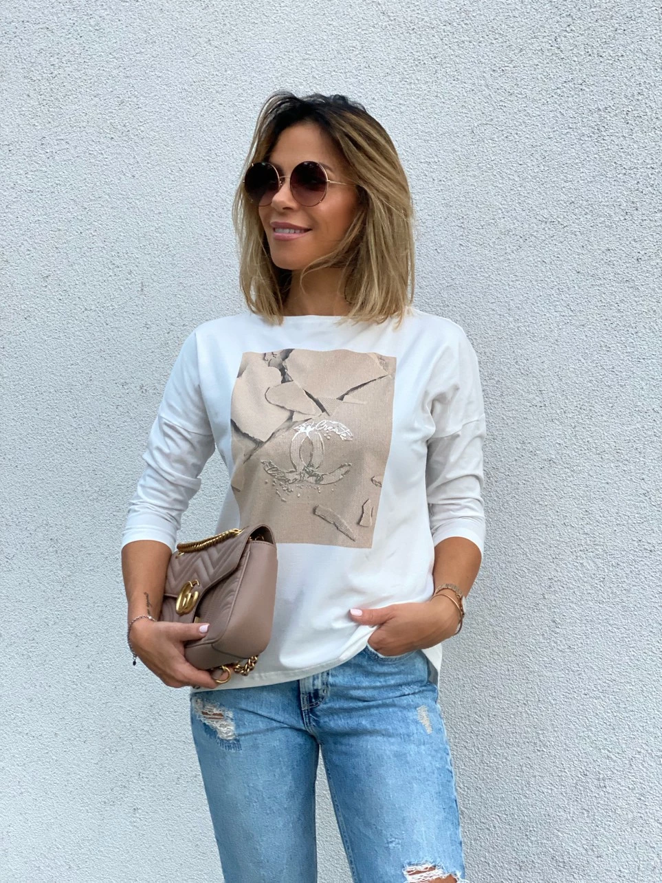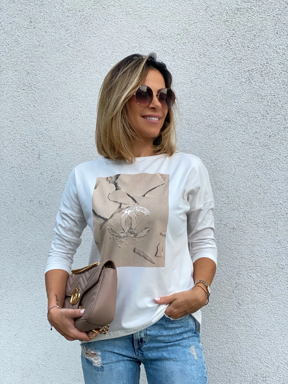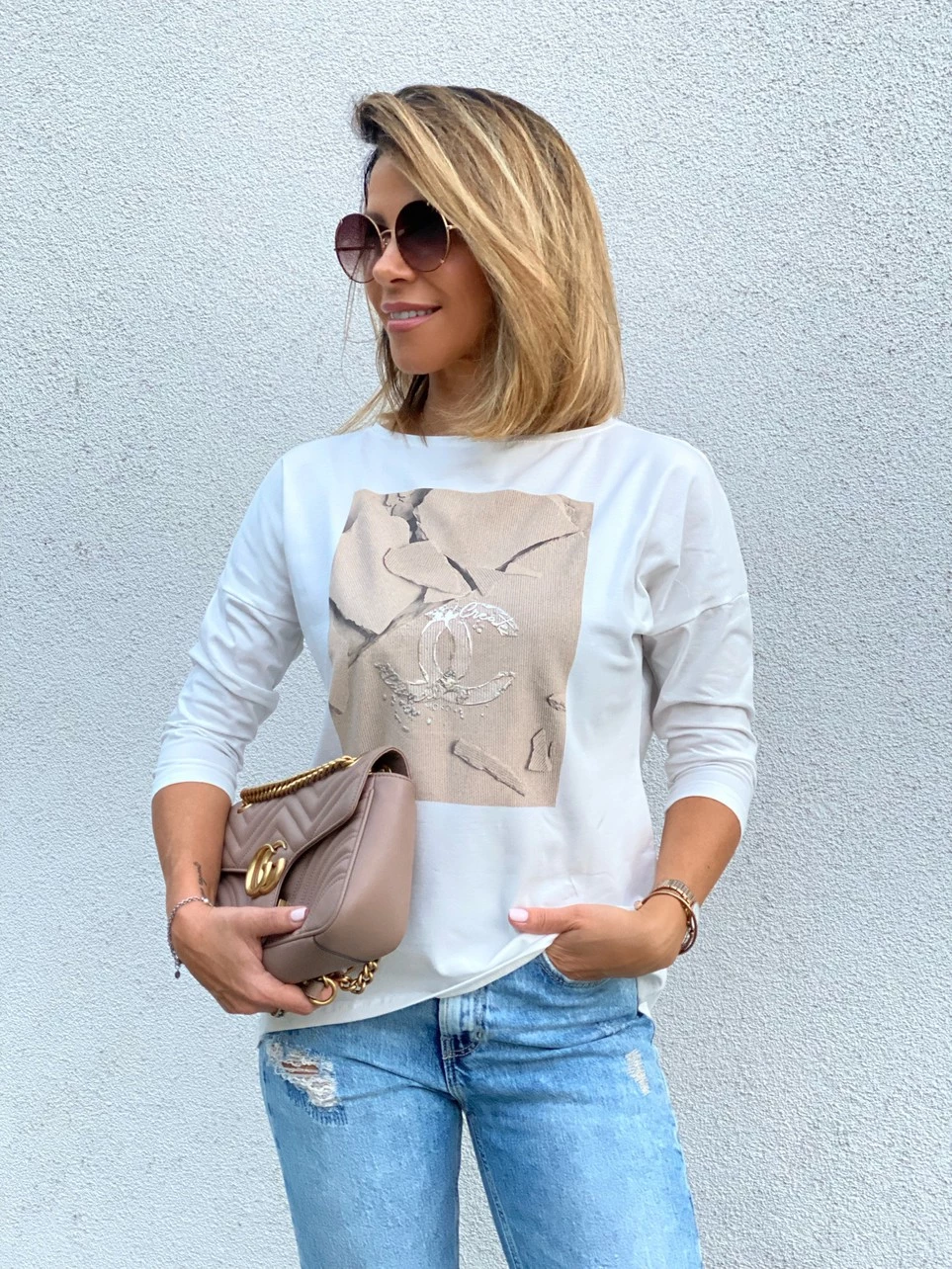 Z przodu przepiękny nadruk pokruszonego pudru i złote litery CC.
