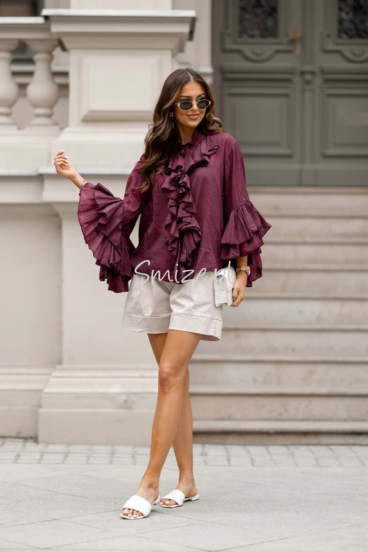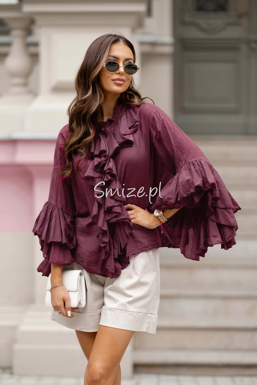 Bawełniana bluzka z falbanami i rozkloszowanymi rękawami, bordowa