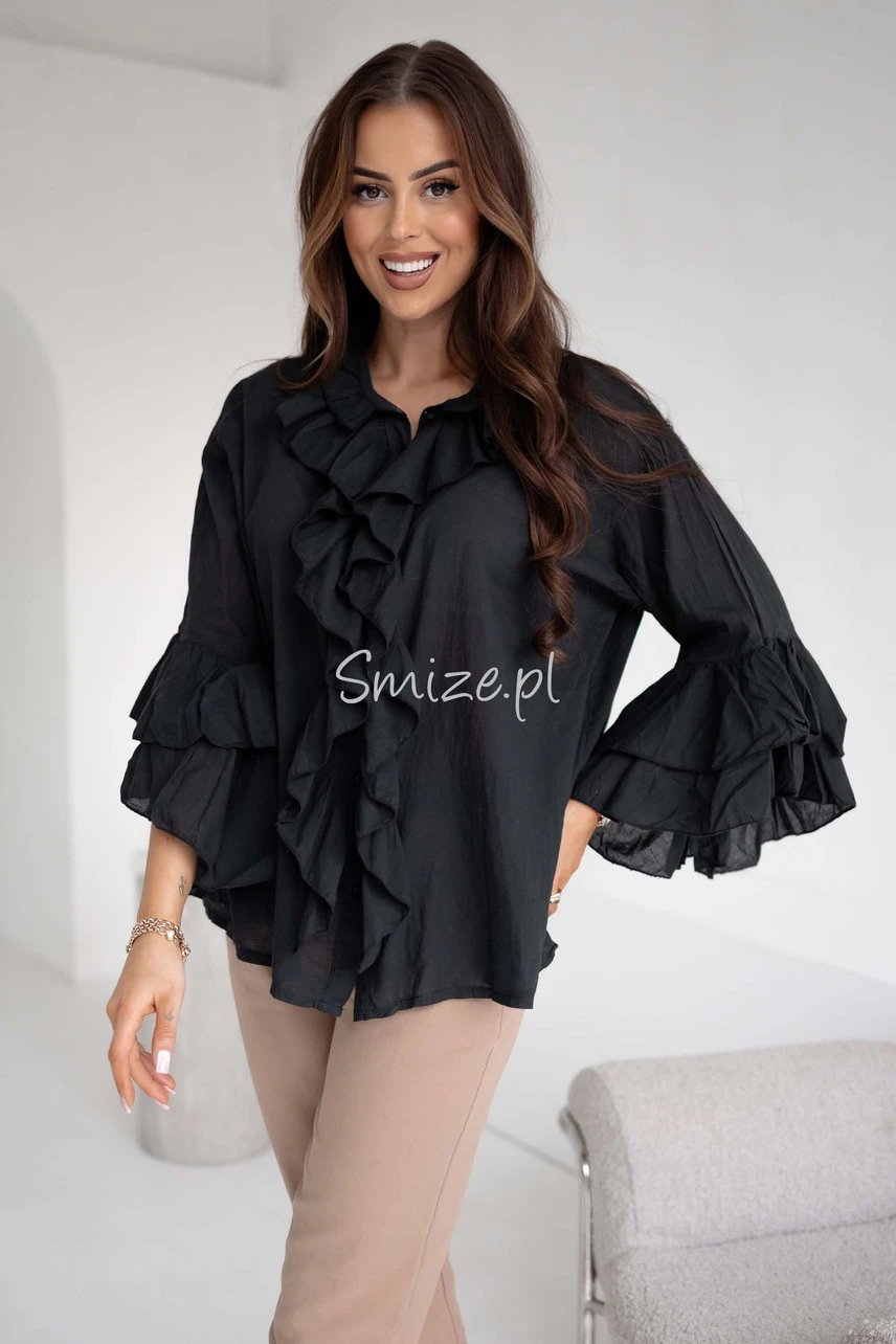 Bawełniana bluzka z falbanami i rozkloszowanymi rękawami, czarna
