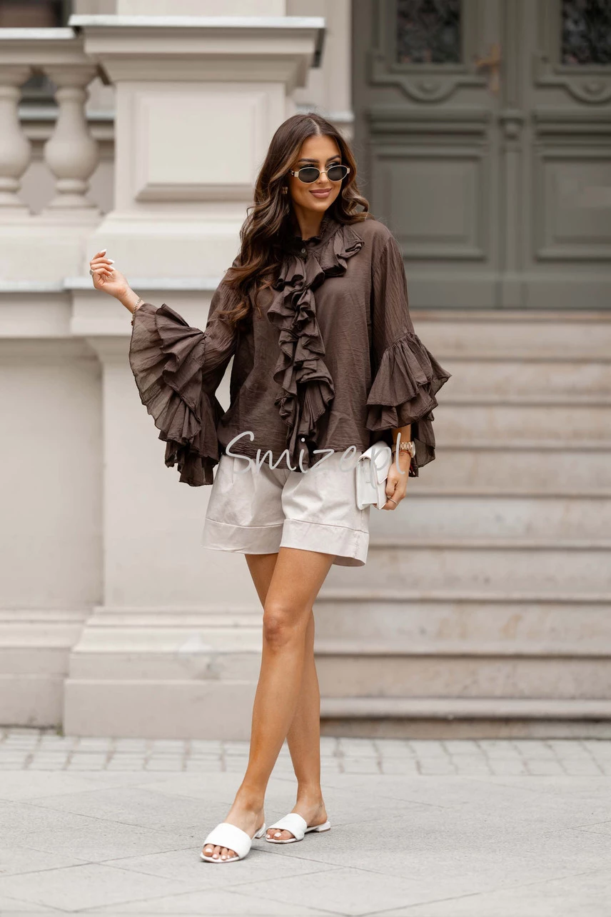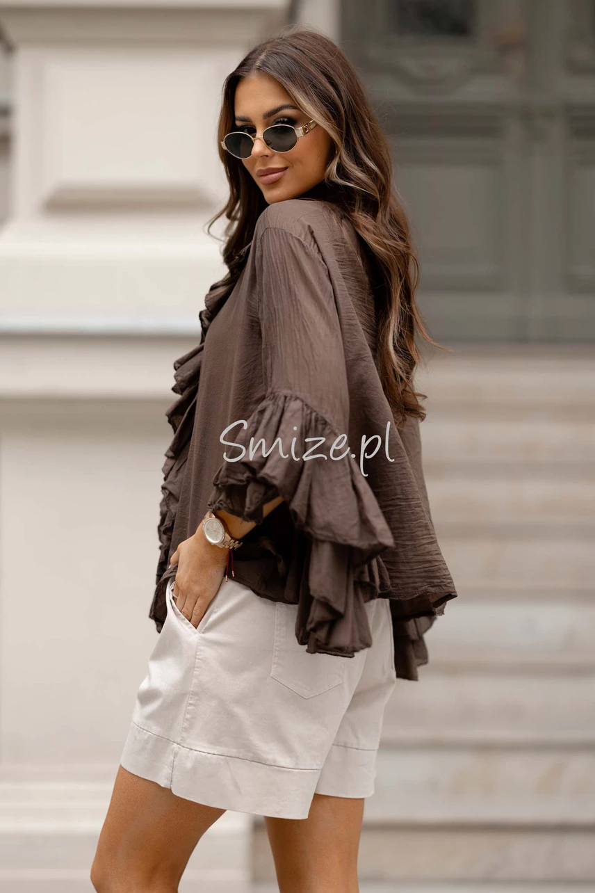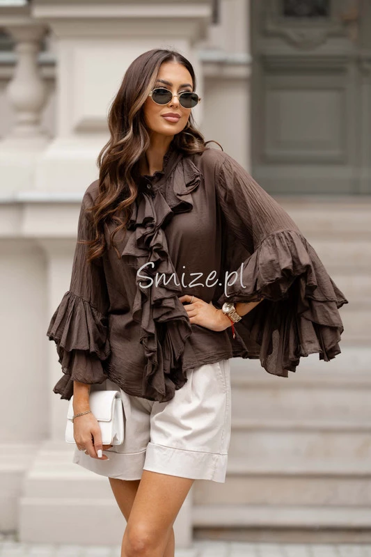 Bawełniana bluzka z falbanami i rozkloszowanymi rękawami, czekoladowa