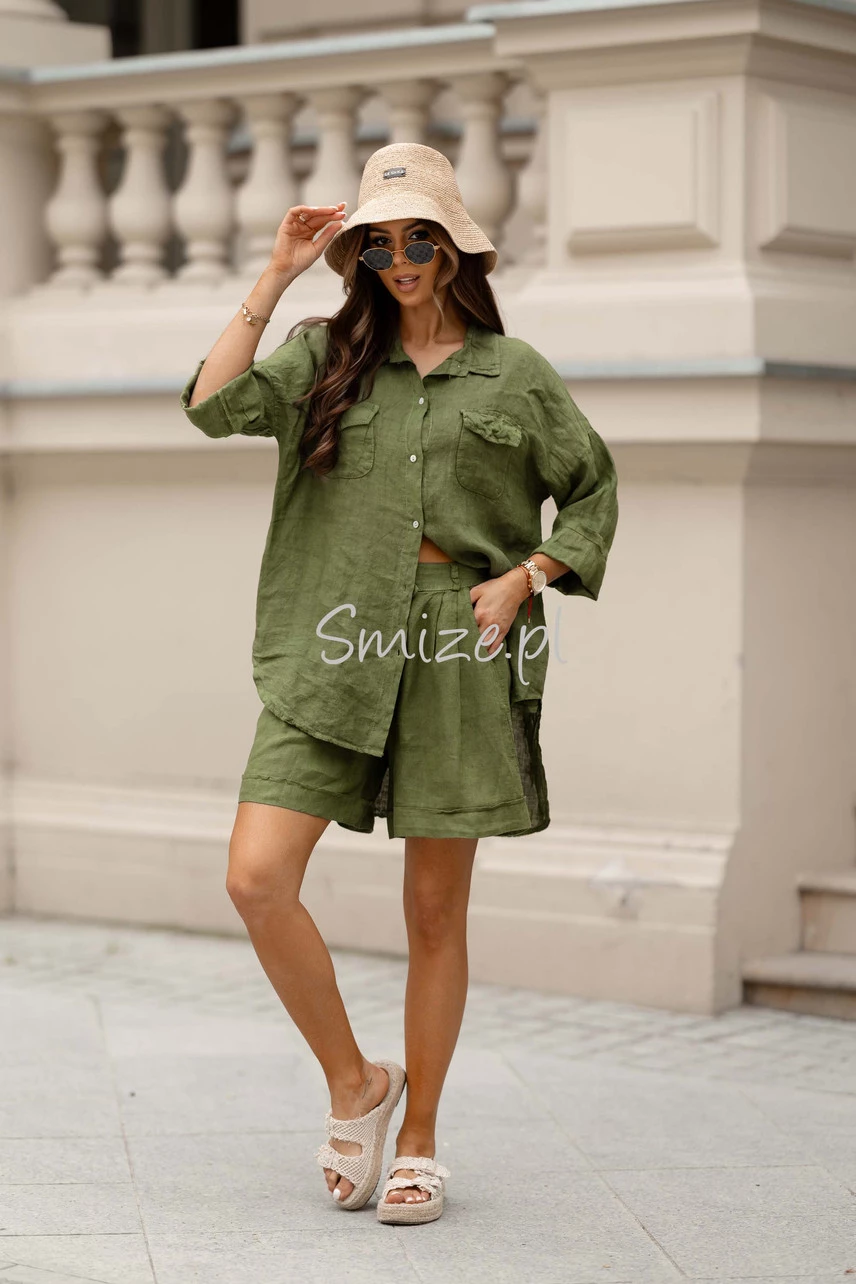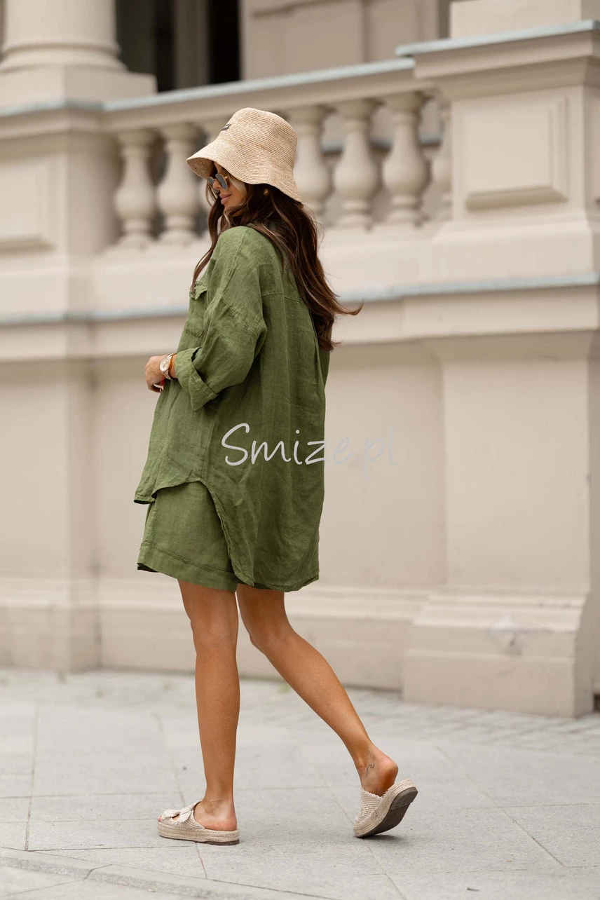 Pięknie prezentuje się w zestawieniu z jeansami lub szortami i oczywiście z lnianymi spodniami.