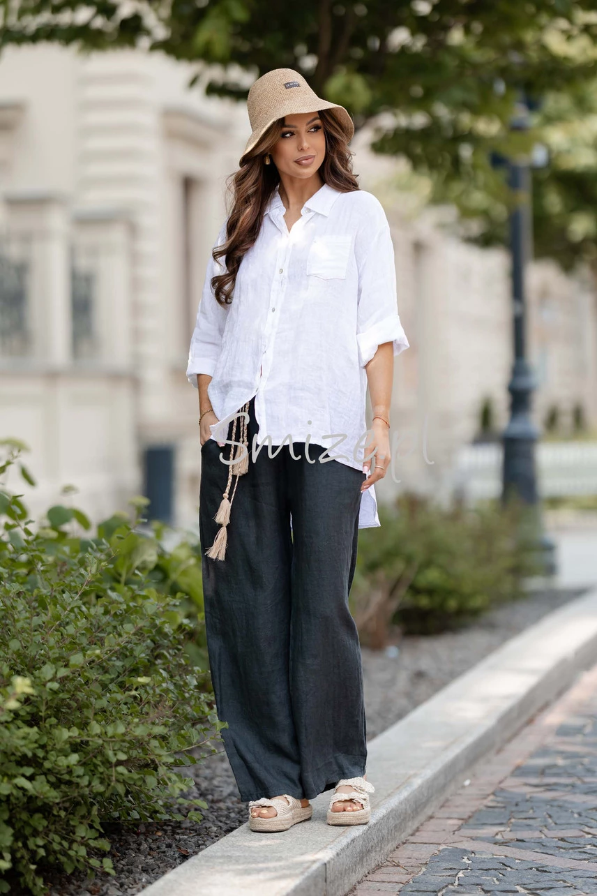 Dłuższa Lniana koszula z jedną kieszonką