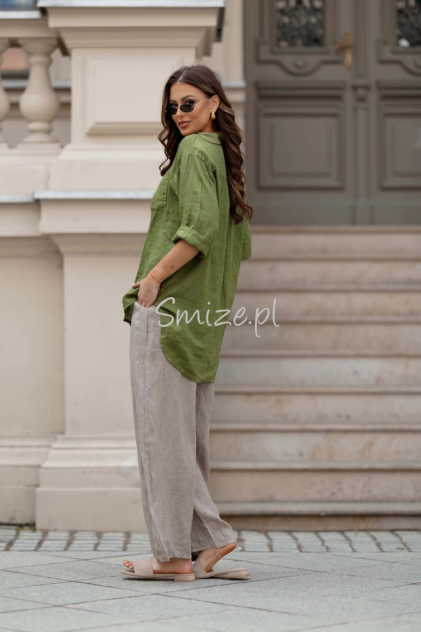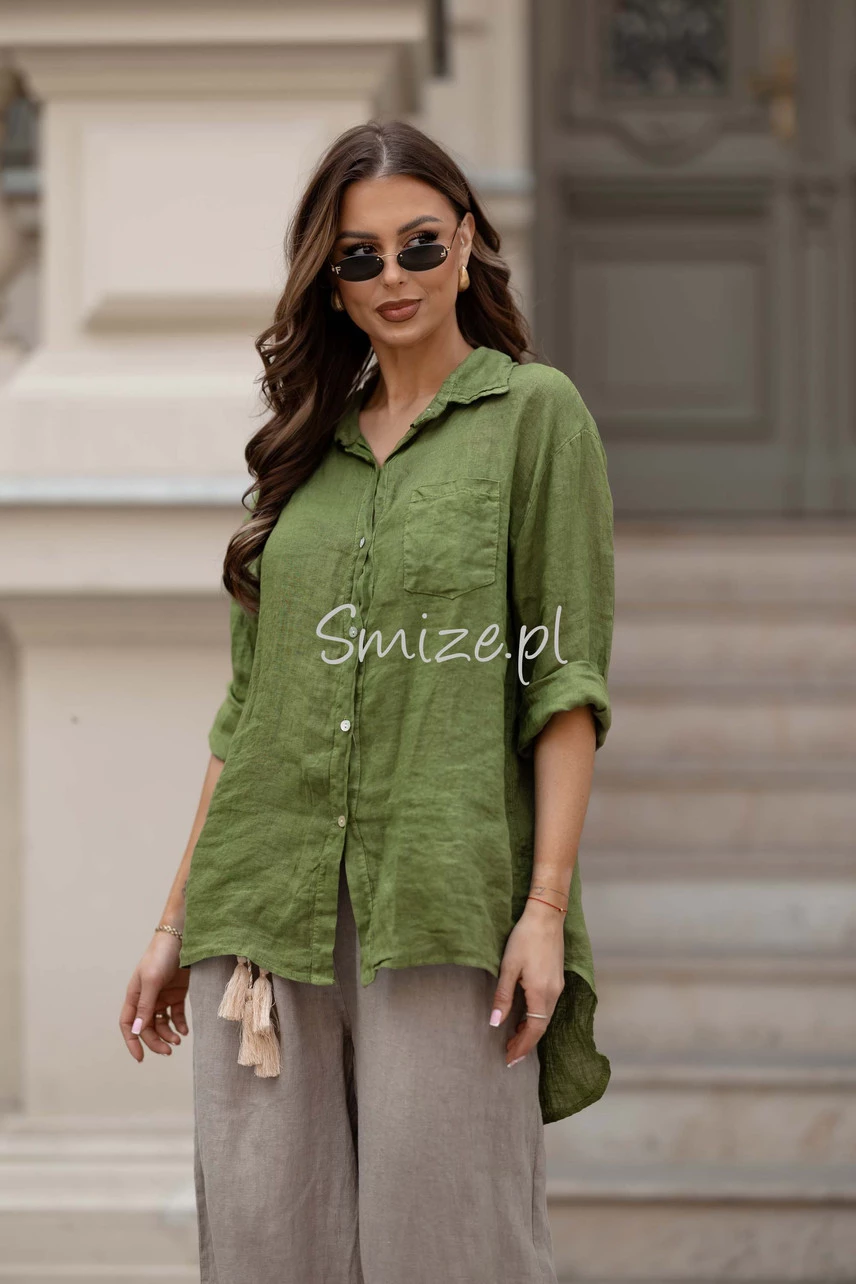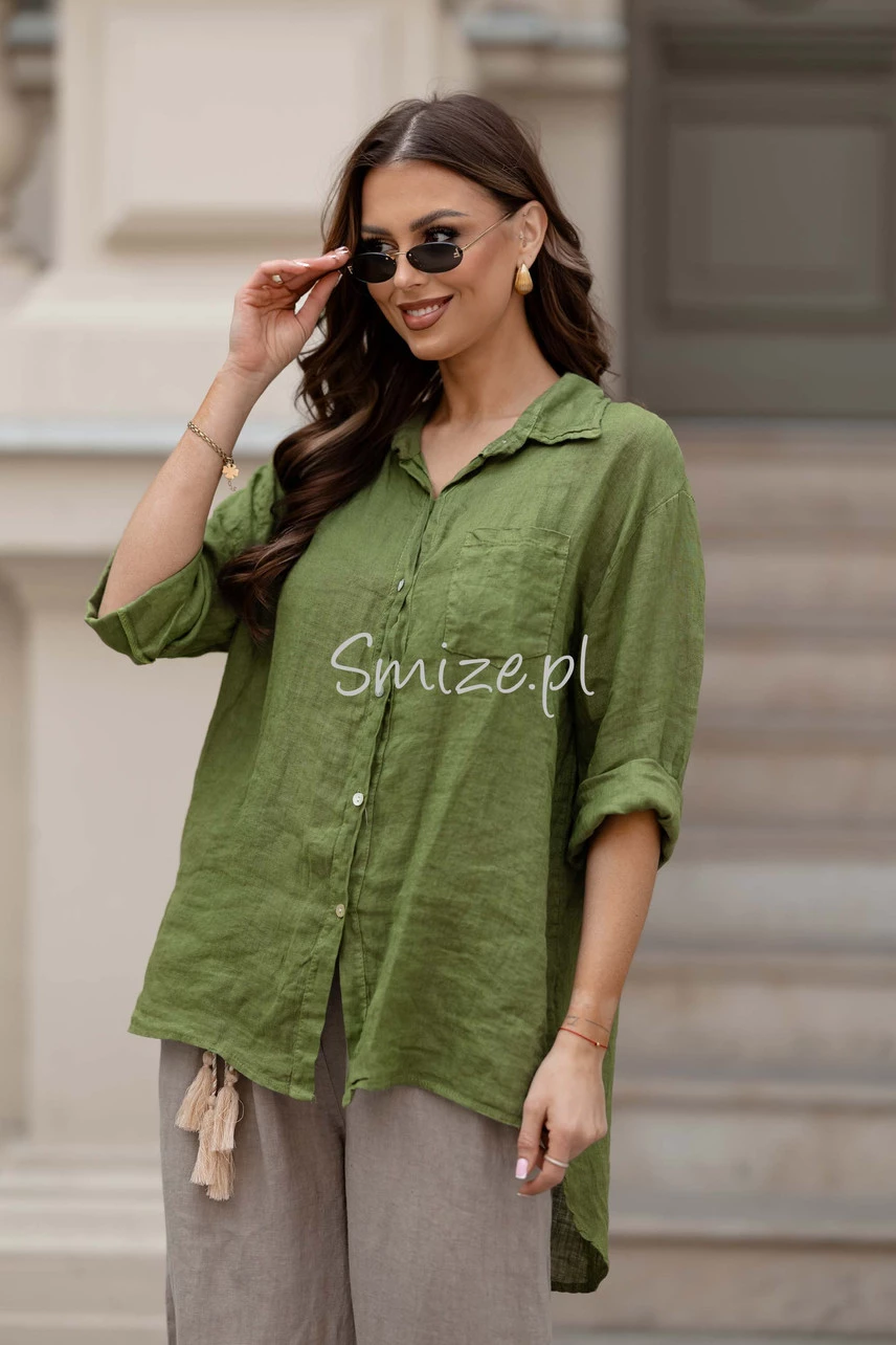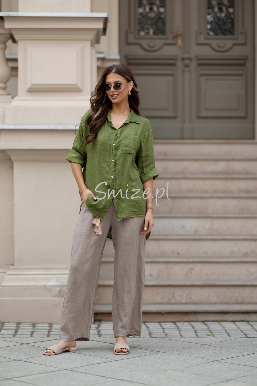 Pięknie prezentuje się w zestawieniu z lnianymi spodniami, szortami lub spódnicą dostępnymi w naszej kolekcji.