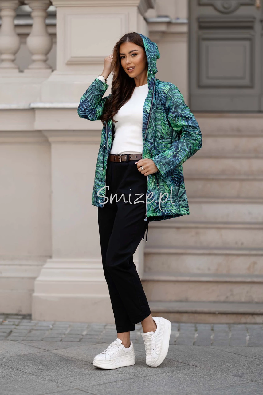 Ta lekka parka przeciwdeszczowa z tropikalnym motywem liści to idealny wybór na spacery, podróże i aktywne chwile na świeżym powietrzu wiosną, latem i jesienią.