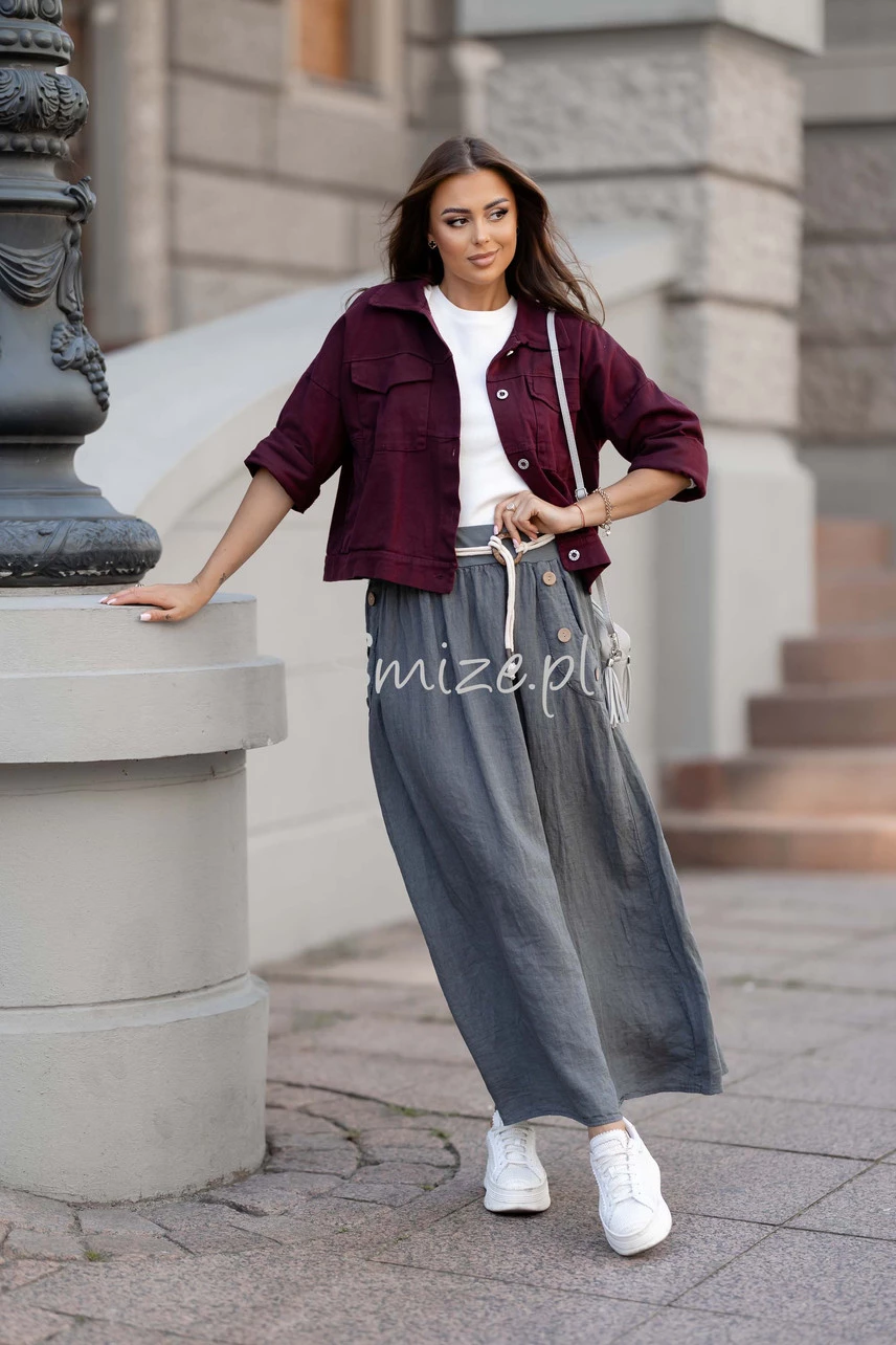 Poznaj modny zestaw: lniana spódnica maxi ze sznurkiem + kobieca kurtka bomberka z kieszeniami. Bomberka wprowadza nutę miejskiej nonszalancji, a spódnica zapewnia lekkość i swobodę. Razem tworzą look, który sprawdzi się zarówno w mieście, jak i na wakacjach.