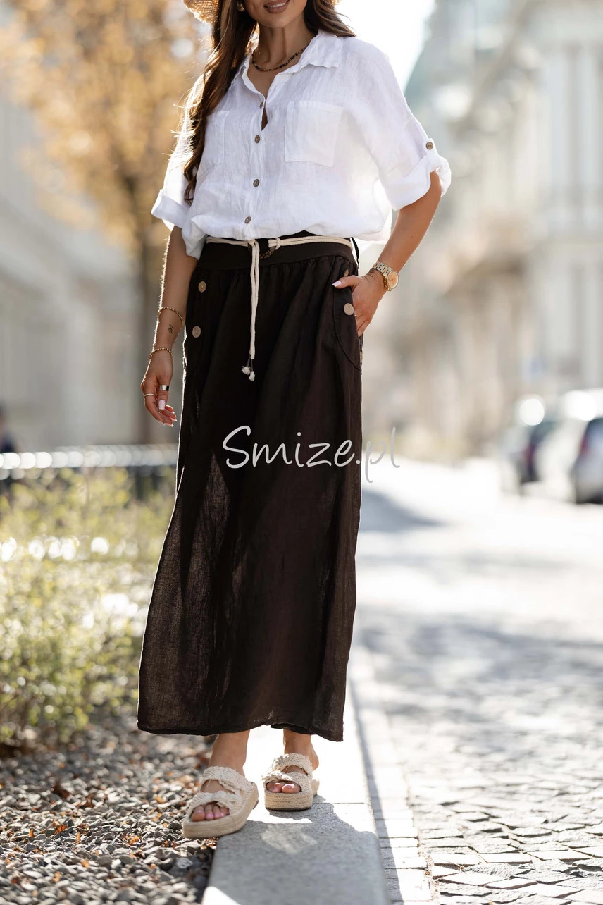 Długa zwiewna Spódnica lniana ze sznurkiem czekoladowa